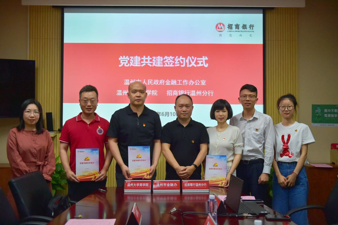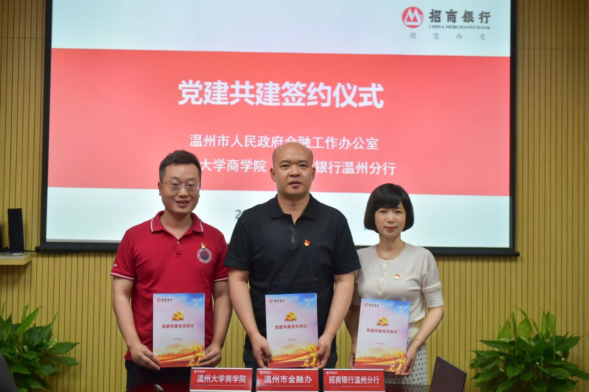 活动伊始,招商银行温州分行、市金融办、温州大学商学院代表依次分享了2022年各自所在单位的党建工作重点与特色工作开展情况,并就下半年三家单位合作共建的重点内容展开探讨,同时围绕党建活动策划、品牌宣传、培训学习、文化建设等方面拟定初步合作计划;最后,三方正式签订党建共建合作协议,为后续各项工作奠定良好基础。