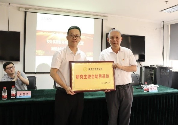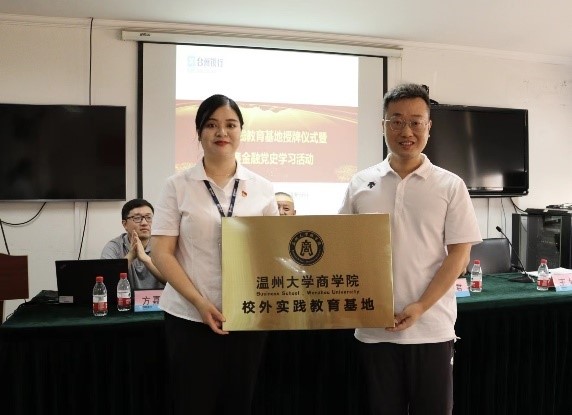 在商学院老师以及银行工作人员的见证下,温州大学商学院与台州银行温州分行进行授牌环节。商学院将温州大学商学院校外实践教育基地、研究生联合培养基地两块牌子授予台州银行温州分行。