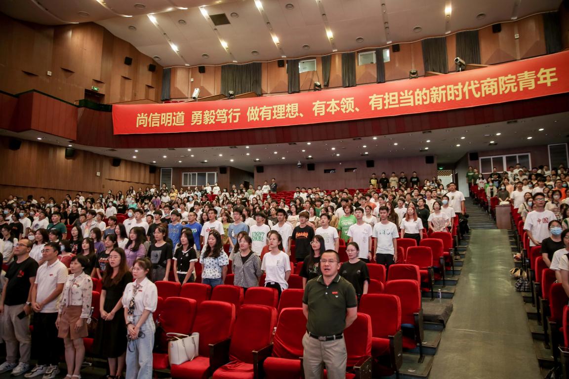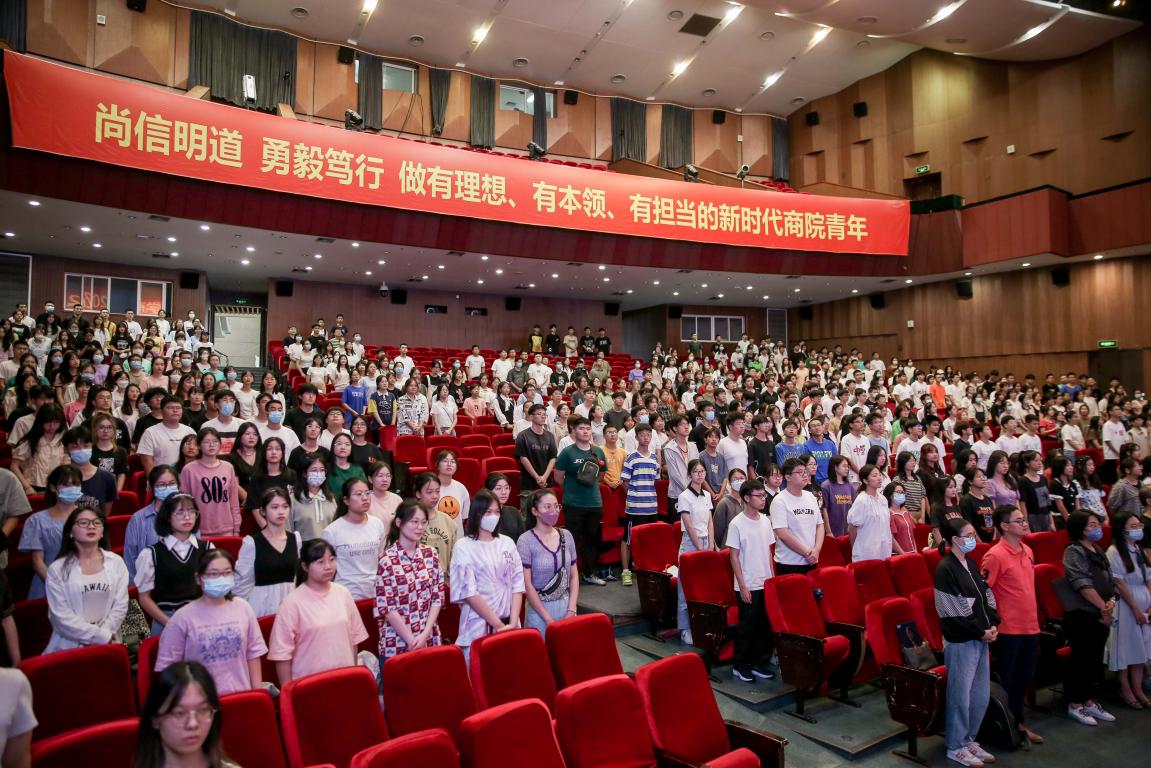胡振华院长向新生们细数了商学院的发展历程、师资力量、专业和学科建设情况,科研成绩、人才培养成果等方方面面的办学情况,并用生动的语言从内容、对象、视角、学习方法等方面,深入浅出地解释了经济学和管理学二者的不同。此外,对于商科学生应该具备的素质,他提出了“四个四”,开通网银账户、网购账户、证券账户和护照四个户头;学好汉语、英语、计算机语言、数学语言四种语言;利用好教室、寝室、图书馆和社会四个空间;处理好与同学、老师、家长、社会的四种关系。最后,他祝愿新生都能在最美好的年华创造属于自己的美好人生!至此,2022级新生开学典礼圆满落幕,希望所有同学都能秉持“求学问是、敢为人先”的校训精神和“尚信明道、勇毅笃行”的院训使命,以丹心绘赤诚,以行动筑未来,只争朝夕,不负韶华,乘时代之风,与使命同行,做担当时代大任的商院新青年。