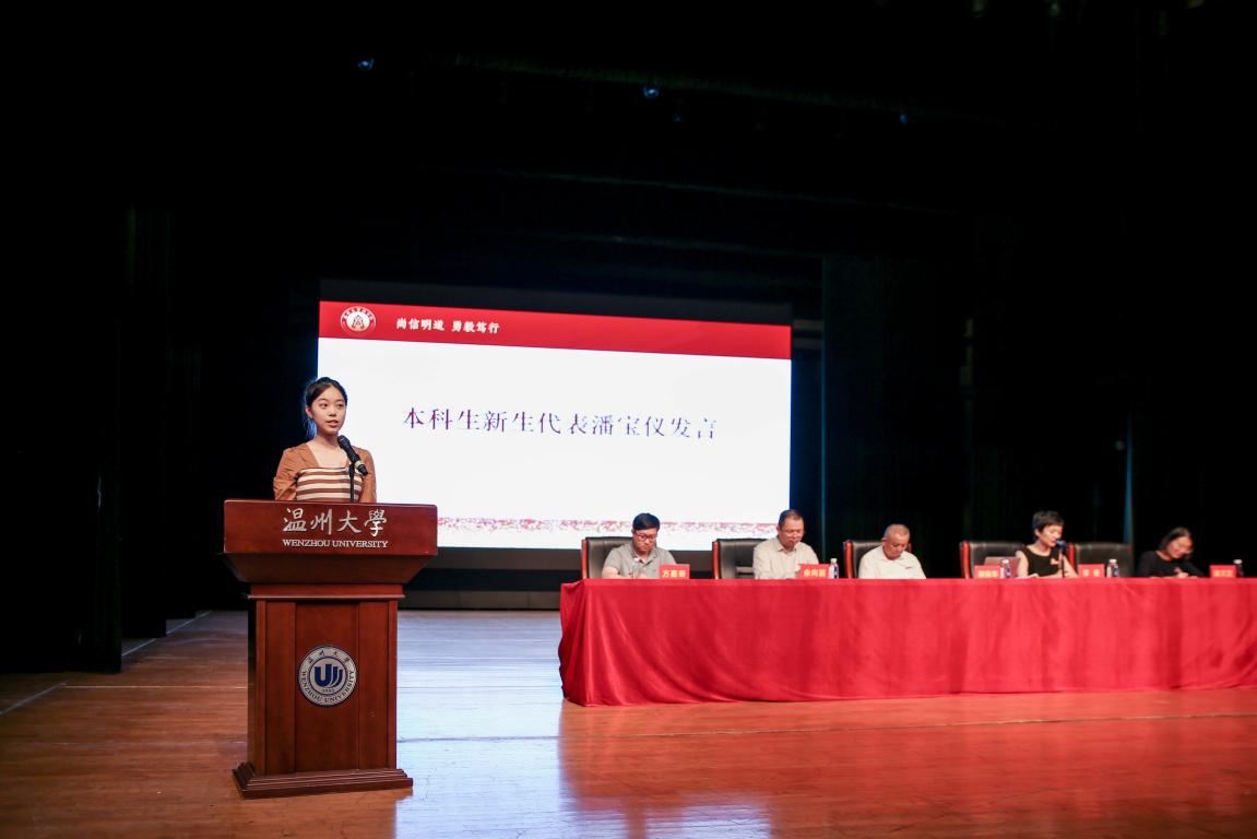 22财务管理2班潘宝仪作为本科生新生代表发言。她首先表达了对老师们的问候、对家长的感谢以及对接下来大学生活的向往。接着,她对大学生活做出了规划和展望:作为大一新生,我们要明确自己的定位和方向,要心怀坚持不懈的追求,提升个人能力、激发潜能,也要将小我融入大我,承担国家赋予我们的责任与使命。