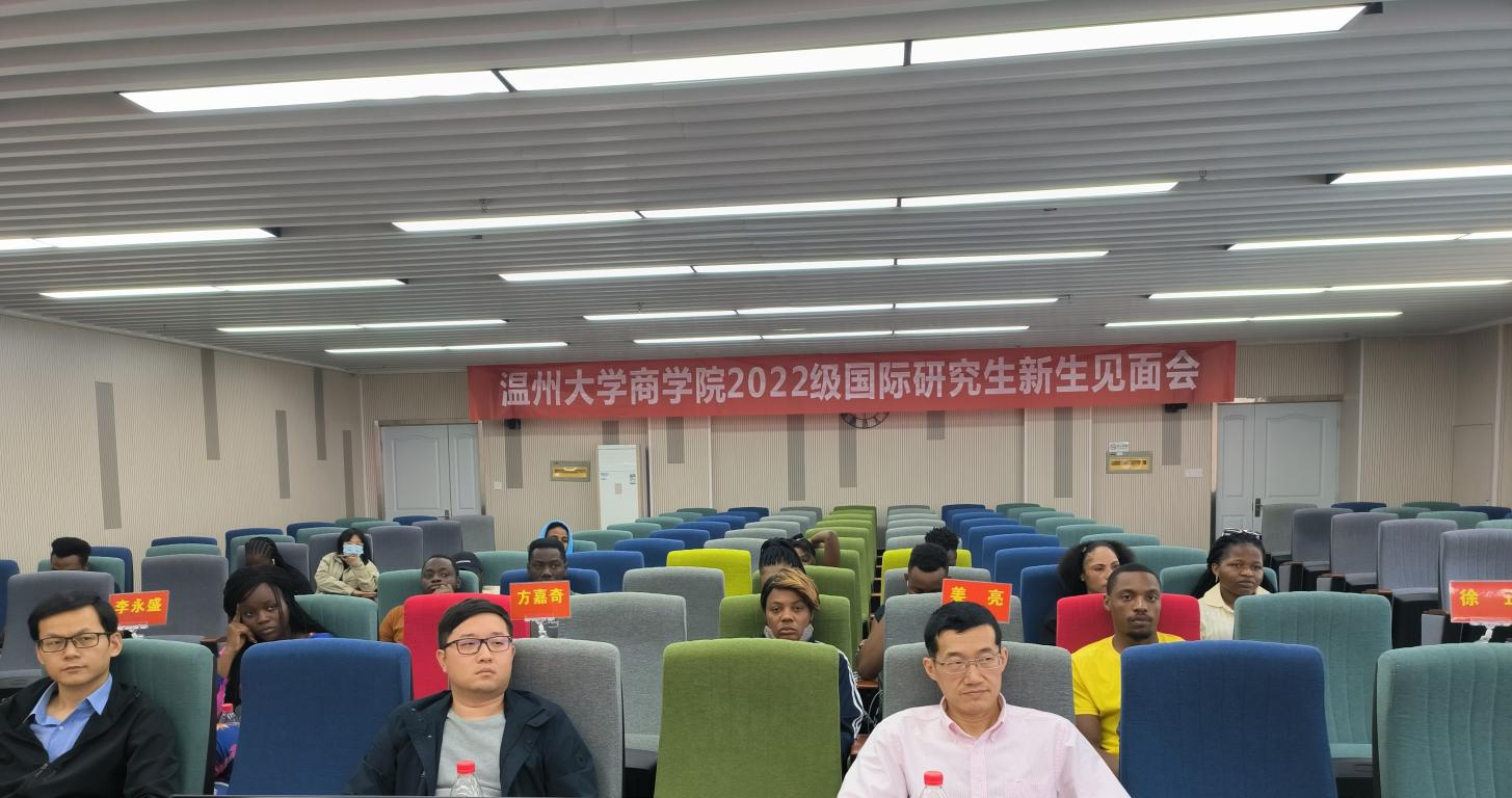2022年10月20日下午,在商学院A226仲辉商道讲堂,温州大学商学院2022级国际硕士研究生新生见面会如期举行。商学院院长胡振华、商学院党委书记李密、商学院副院长陈文芝、国教部主任徐正、国际研究生负责人王露,以及22级国际硕士研究生导师等出席了此次会议。由于新冠疫情的影响,本次会议线上线下同步举行,18名学生现场参与,其他7名学生通过钉钉会议参会,全场会议以中英双语进行。