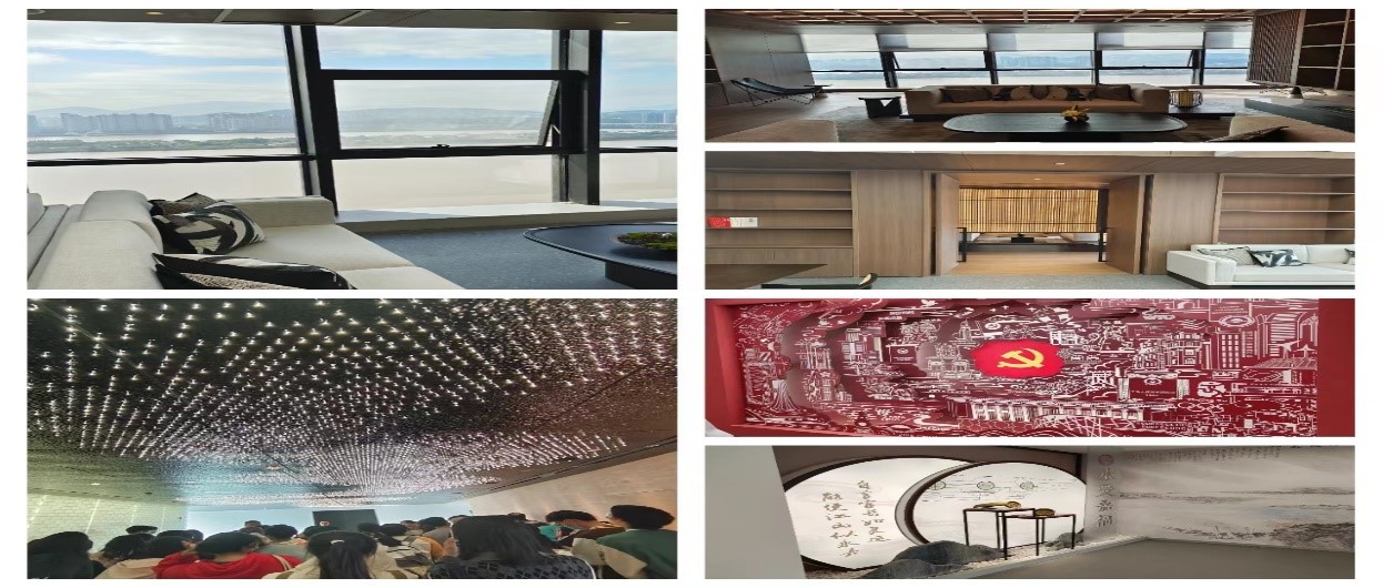 22层的会客厅更是直接展现出“永嘉人自己的银行”宗旨。门口天花板别具匠心的用一节节二级灯管连成了一条楠溪江,而墙壁上也借由特殊材质的贴砖,在色差的参差中勾勒出永嘉的山貌。会客席出则直接使用大面积的玻璃以留给客人足够的视觉观感。同时,永嘉农商银行的党建阵地-红色家园也设在22层,把党的活动中心建成党员之家、银行员工之家,增强员工归属感获得感。