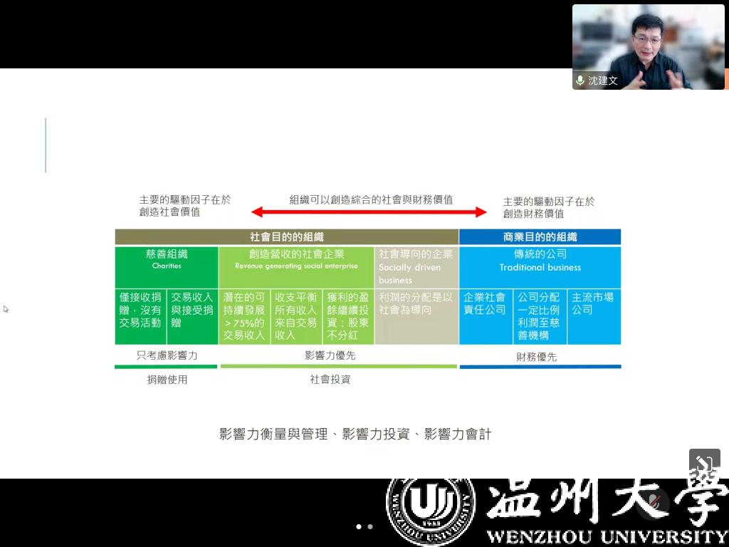 2022年11月9日下午,商学院工商系在商学楼A222举办教科研系列讲座,会上邀请了中国台湾地区中央大学教授、尤努斯社会企业中心主任沈建文博士做线上学术讲座。