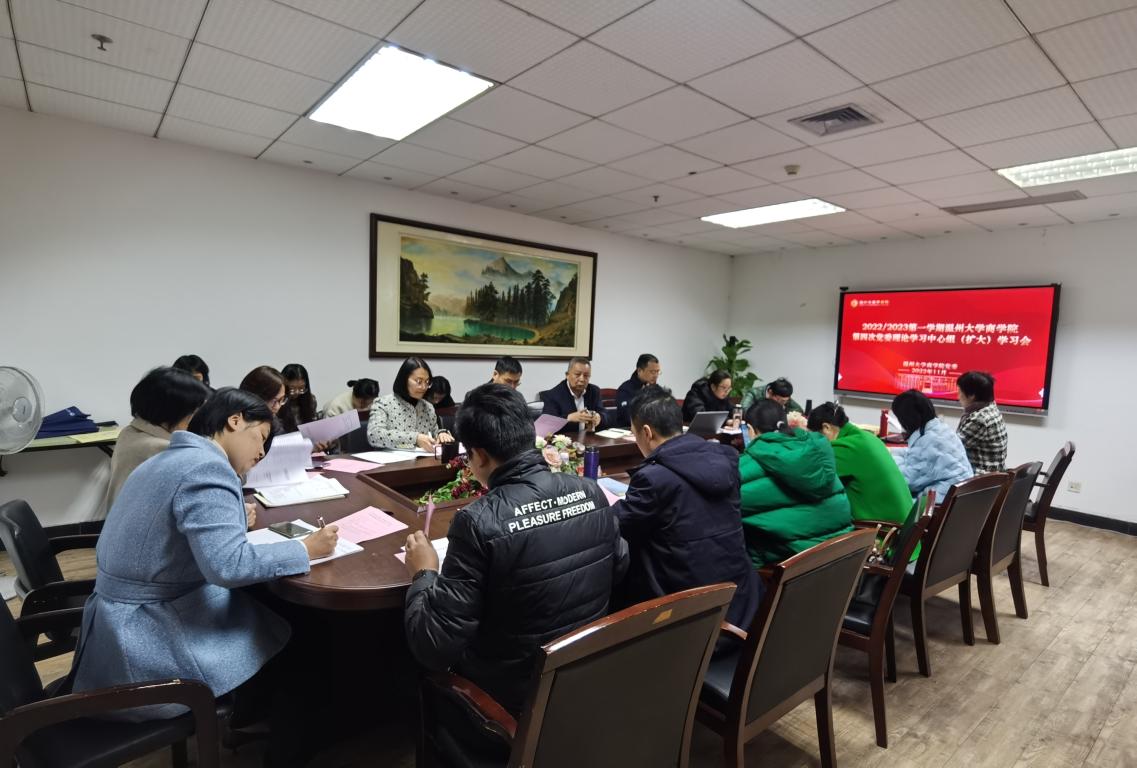 2022年12月2日上午,温州大学商学院2022-2023学年第一学期第四次党委理论学习中心组(扩大)学习会在学院A222会议室顺利召开。院领导班子成员、党委委员、纪委委员、支部书记以及各科室负责人参会,会议由党委书记李密主持。