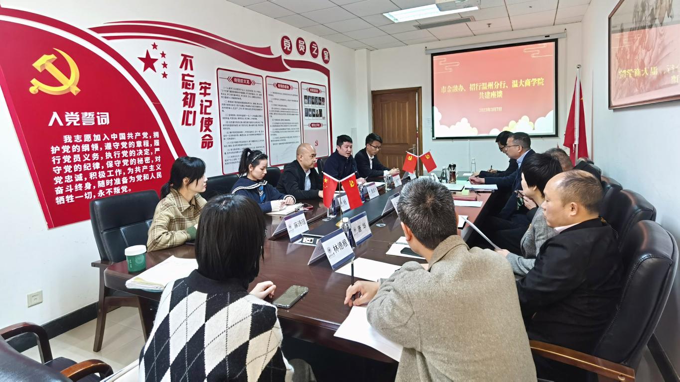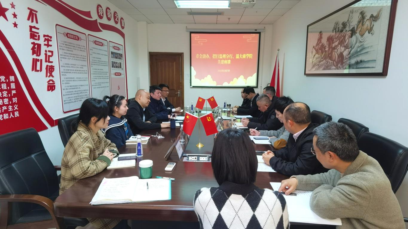 2023年3月7日上午,温州市金融办金融稳定处处长詹昌为等一行2人、招商银行温州分行零售金融事业部总经理刘斯时等一行3人来我院调研交流。商学院院长胡振华、党委书记李密、金融系教师代表等参加座谈交流活动。双方围绕“银校共建”主题进行了深入会谈。会议由唐华副书记主持。