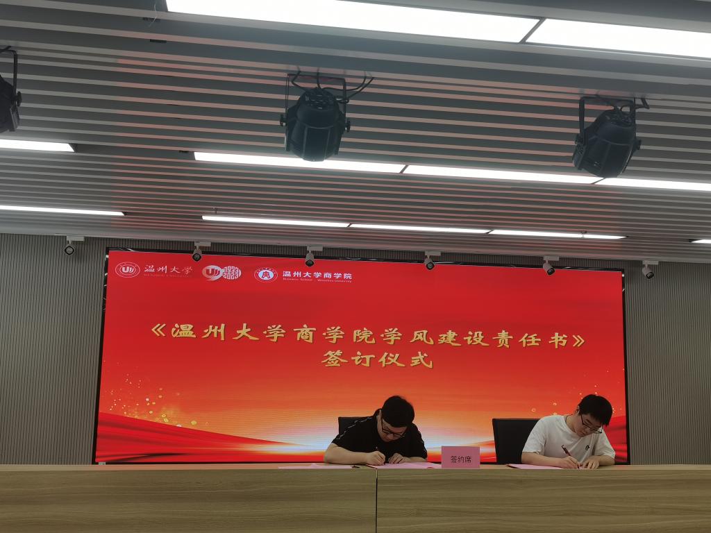 随后,由院长助理方嘉奇老师宣读《温州大学商学院学风建设责任书》,并与代表班级签订学风建设承诺书,这一张承诺书是一份沉甸甸的责任与义务,代表这商院师生对于建设优良学风的信心与决心。