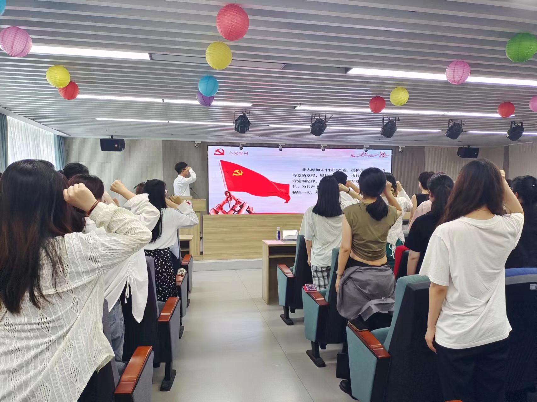 毕业生党员代表蔡瀚慷同志带领全体毕业生党员重温入党誓词。不忘初心才能永葆本色,重温入党誓词作为一场心灵的洗礼,提醒每位毕业生党员时刻牢记党员身份,永葆政治本色。