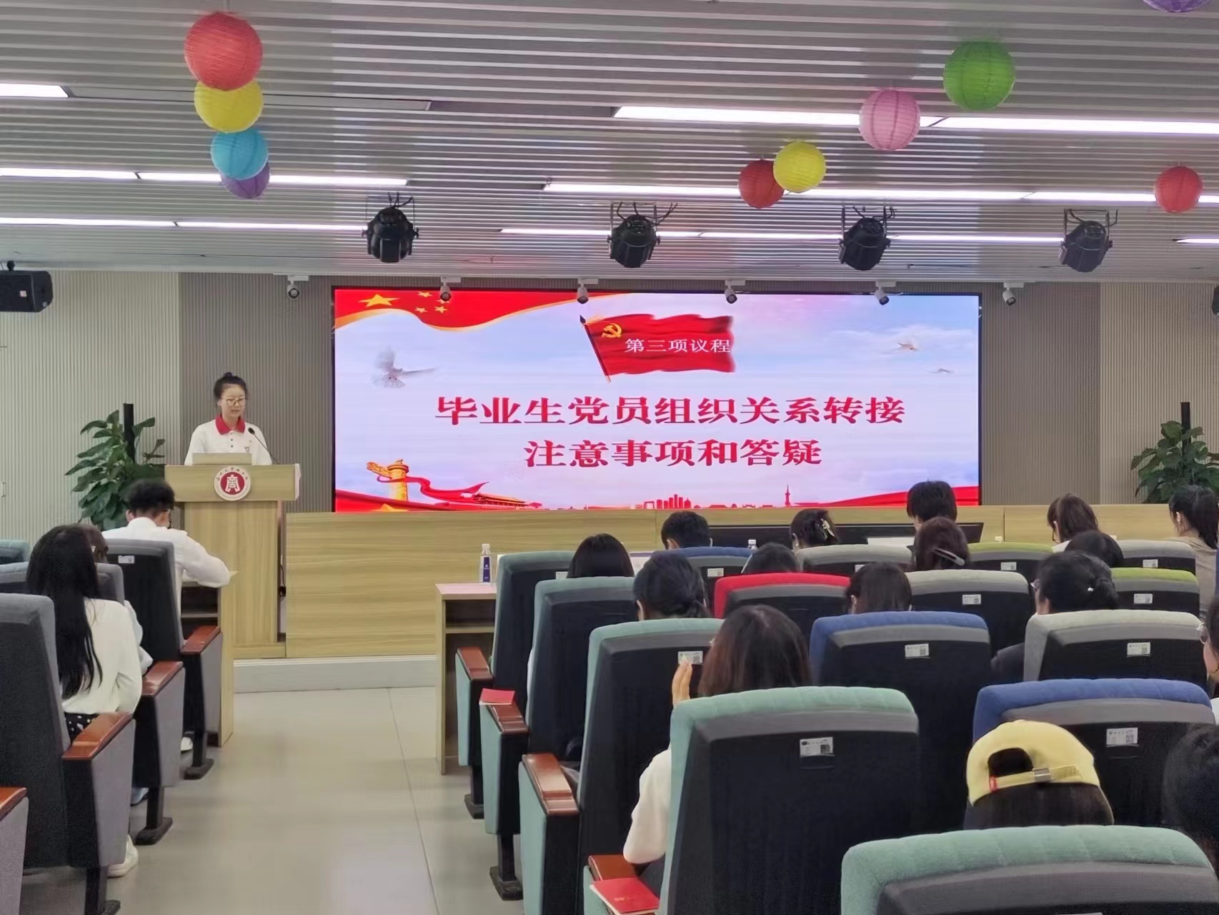 紧接着,学生党建负责人聂海燕老师为大家详细讲解了毕业生党员组织关系转接的办理手续和注意事项,她分别列出了党员组织关系转接的三种情况,还对组织关系介绍信填写、毕业生党员组织关系转接要求、组织关系转接中常见的问题等进行了说明,同时也对毕业生组织关系转接过程中常见的问题进行了一一解答。