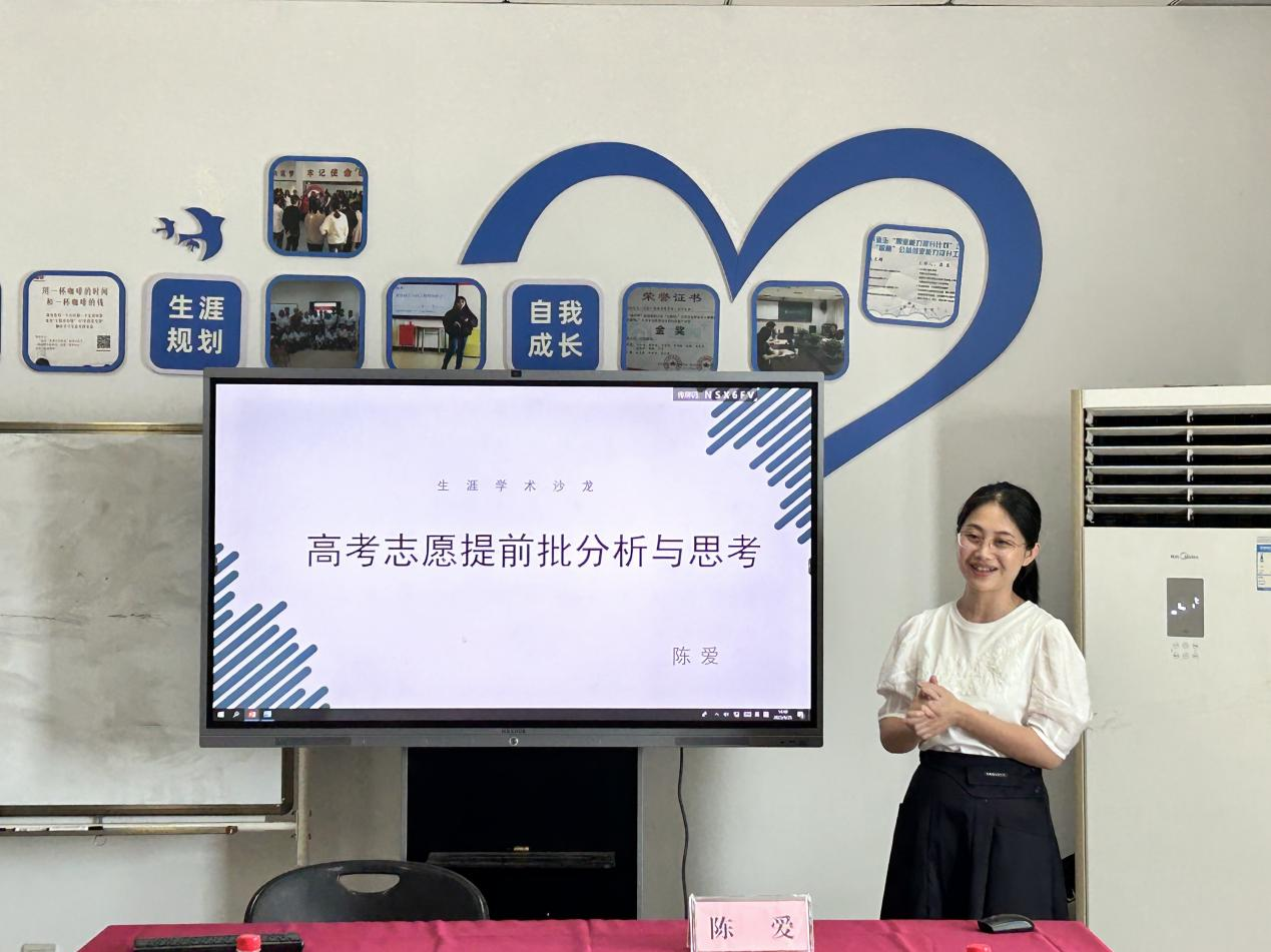 接着,温州大学马克思主义学院专任教师陈爱老师分享主题为《高考志愿提前批分析与思考》的专题报告。陈爱老师分别从“为什么—高考志愿提前批招录目的、是什么—高考志愿提前批填报优势、怎么做—高考志愿提前批报考准备”三个方面作了深入浅出的介绍。她指出,提前批招录主要是为了服务国家优先战略、推动多元评价方式、促进教育机会公平,报考学生应根据自身优劣势选择提前批的类型,以选择喜欢的职业生涯,进而实现有效就业。