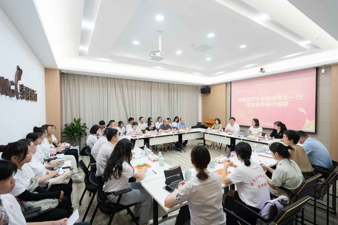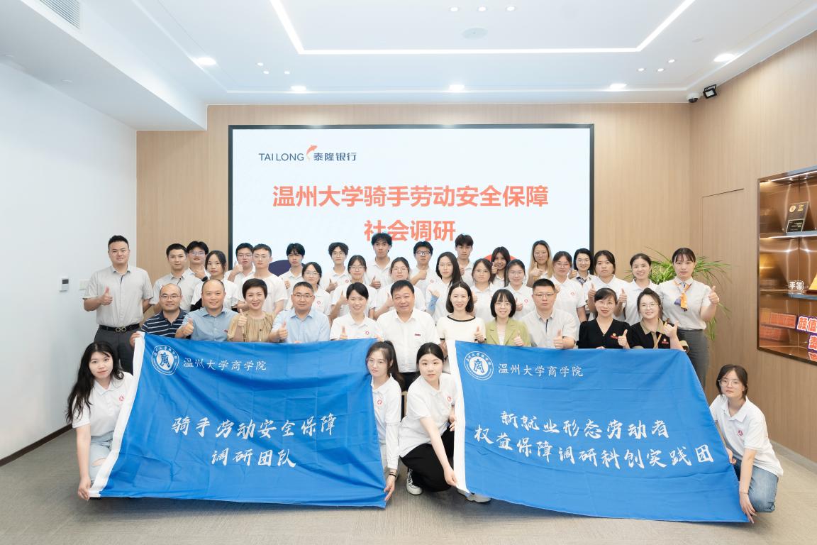 7月13日上午,温州大学校长赵敏、团委书记易招娣、研工部部长高红星、党校办信息科科长郑兆钧、团委学生科技创新指导中心主任张淑娴一行赴泰隆商业银行五马支行慰问我院新就业形态劳动者权益保障调研科创实践团,泰隆银行温州分行副行长蒋丽英、泰隆银行温州五马支行行长章策、泰隆银行温州分行人力资源部总经理陈贞纯、泰隆银行温州分行综合办公室主任工会主席卢劭炜,鹿城团区委书记李璐颖、鹿城团区委办公室负责人谢思倩,温州大学商学院党委书记李密、党委副书记唐华、实践队指导老师夏怡然和学生科辅导员王景欣等陪同慰问。座谈会由温州大学商学院党委副书记唐华主持。