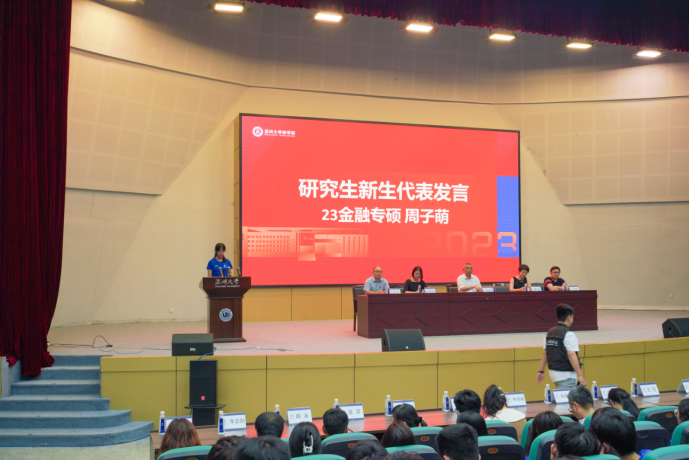 23金融专业研究生周子萌同学作为研究生代表发言。她首先表达了对圆梦温大的欣喜,对深切感受温大文化力量、师资力量的向往。接着,她对大学生活做出了规划和展望:作为23级研究生中的一员,首先应明确自己的定位和方向,心怀高远的学术追求,博采众长、厚积薄发,学术修养与道德修养并进。