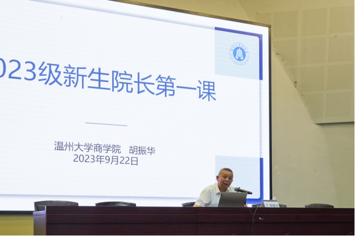 典礼结束后,胡振华院长为新生做始业教育——院长第一课。胡院长从商学院的基本情况、经济学与管理学的区别到商科大学生应该具备的素质三方面为新生作出了详尽介绍,细数了商学院的发展历程、师资力量、专业和学科建设情况,科研成绩、人才培养成果等方方面面的办学情况,并用生动的语言从内容、对象、视角、学习方法等方面,深入浅出地解释了经济学和管理学二者的不同。此外,对于商科学生应该具备的素质,他提出了“四个四”,开通网银账户、网购账户、证券账户和护照四个户头;学好汉语、英语、计算机语言、数学语言四种语言;利用好教室、寝室、图书馆和社会四个空间;处理好与同学、老师、家长、社会的四种关系。最后,他祝愿新生都能在最美好的年华创造属于自己的美好人生!