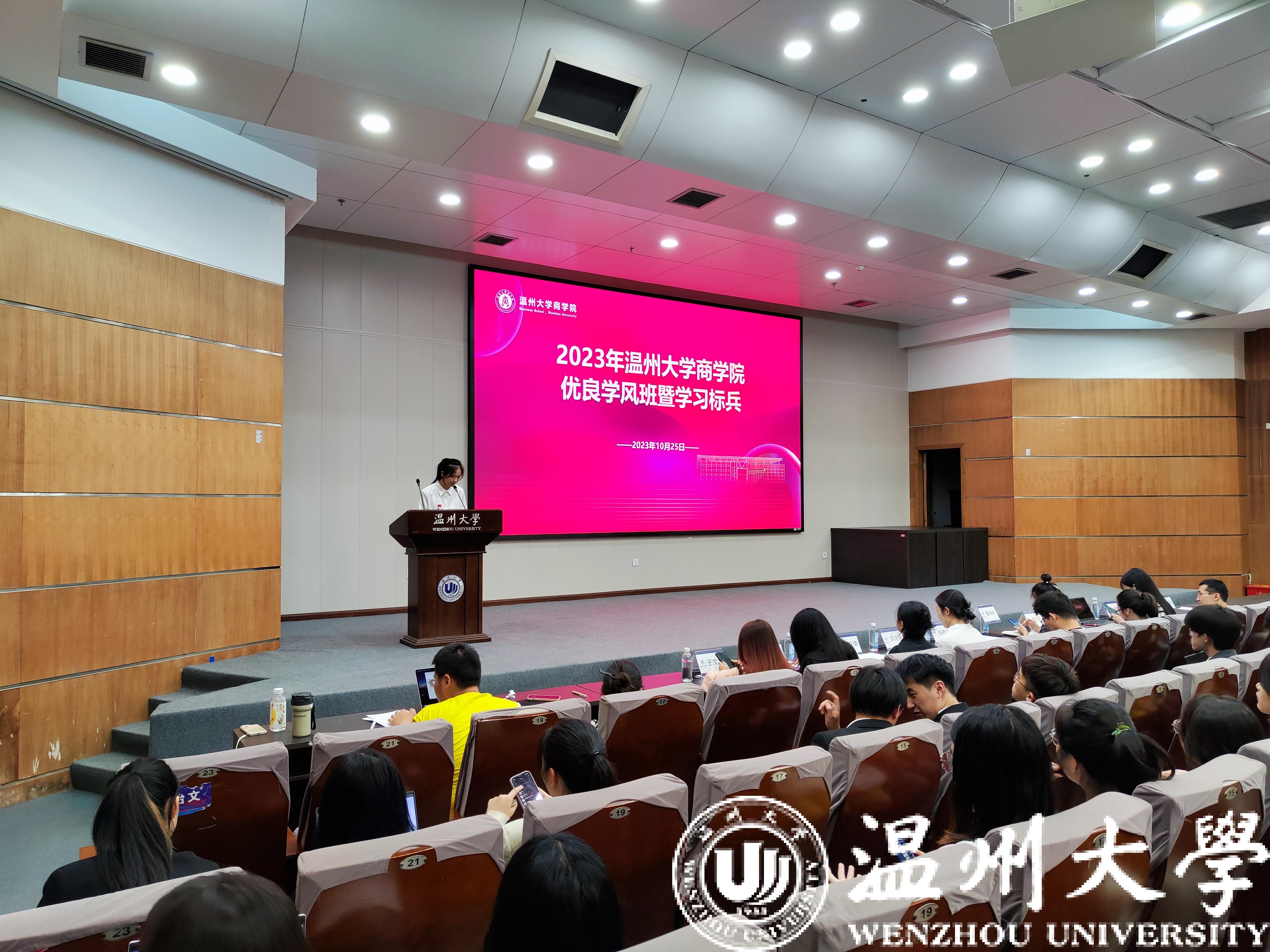 为进一步在学院内营造积极良好的学习氛围,激发学生的学习热情,加强校风学风建设,引导和激励广大学生刻苦学习、立志成才,2023年10月25日18时30分,温州大学商学院2022-2023学年“优良学风班”和“学习标兵”评选活动在北校区信息报告厅顺利举行。学工办辅导员周洁文、聂海燕、张春洋、胡施施,各专业教师代表姚鹏、李志阳、姜亮、王钰等8位老师及院团委学生会主席团成员王文钰、郑佳莹、王安琪等出席并担任评委。活动由学风部唐诗惠主持。