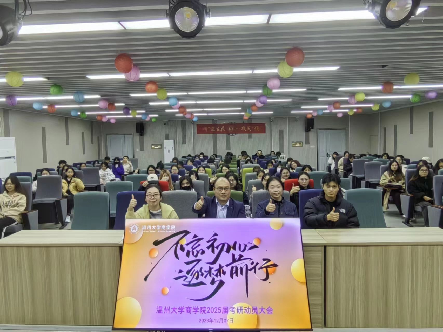为帮助25届毕业生了解考研的基本情况,认清当前考研的新形势,树立考研必胜的自信心,2023年12月7日18时,温州大学商学院25届考研动员大会在商学院A226报告厅顺利举行。商学院党委副书记唐华、学工办主任周洁文、辅导员代表胡施施、聂海燕及我院2025届有考研意向的毕业生参会。本次会议由胡施施老师主持。