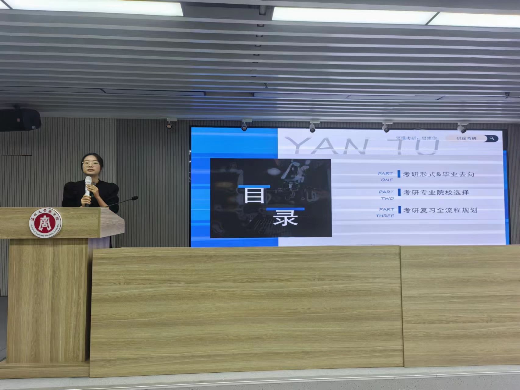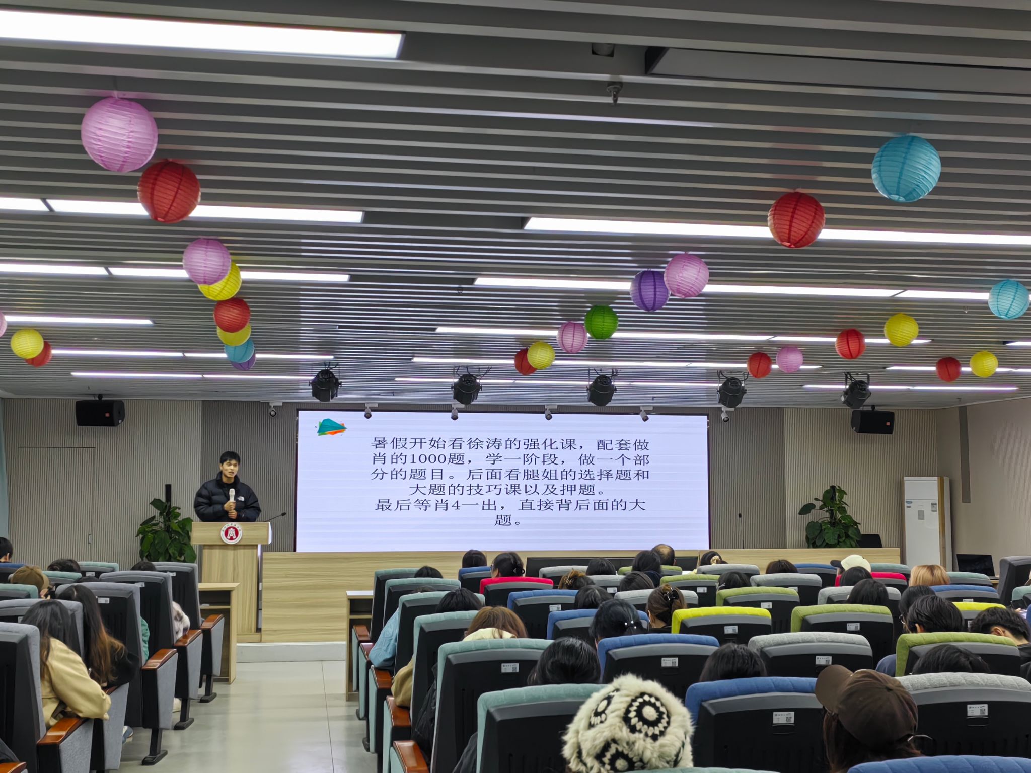 紧接着,我院2023级应用经济学硕士研究生任徐龙为同学们分享自己的考研经验和心得,用自身的经验和方法帮助学弟学妹从容应对考研。 最后,研途机构的诗诗老师从专业的角度向同学们分析考研形势,并强调了选择专业院校的重要性,同时将择校的方法和考虑因素详细地介绍给大家,并为同学们考研备考复习提出了指导建议。