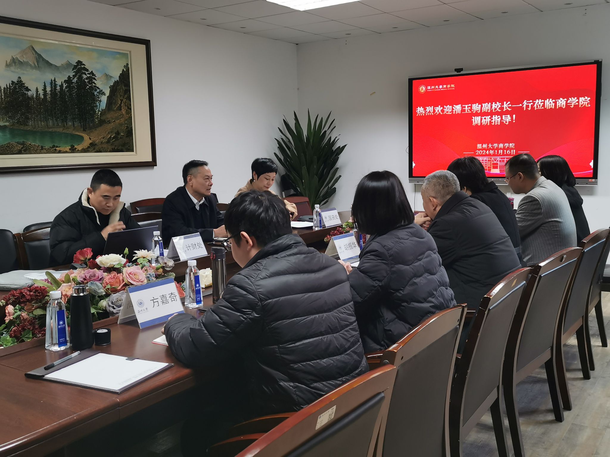 2023年1月16日上午,潘玉驹副校长一行调研商学院,国资处处长张若妤、计财处副处长任瑞璋陪同调研。商学院全体班子成员及学院办公室参与调研会。