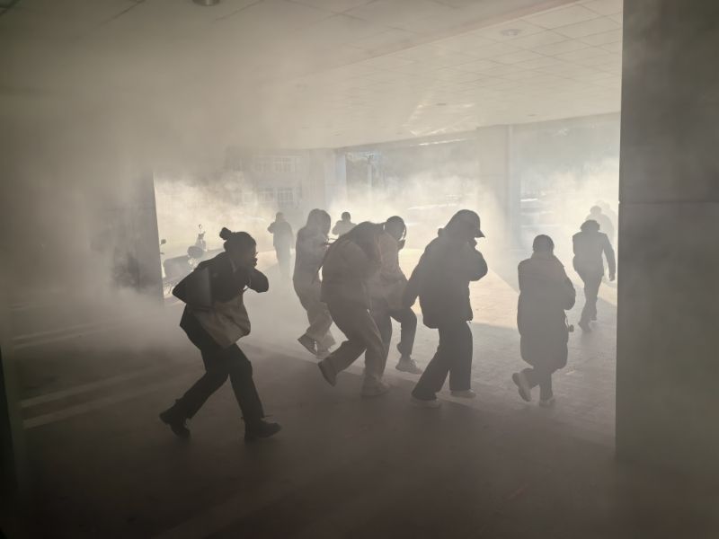 随着演练警报声的响起,楼道内预设起火点浓烟滚滚,在保卫处老师的指引下,学生捂住口鼻,降低身姿,沿着预定的疏散路线,快速有序地撤离至安全地带,站队、清点人数、汇报情况。整个疏散过程配合默契,疏散路线清晰,组织有条不紊,人人各尽其责,达到了“迅速、安全、有序”的演练目标。
