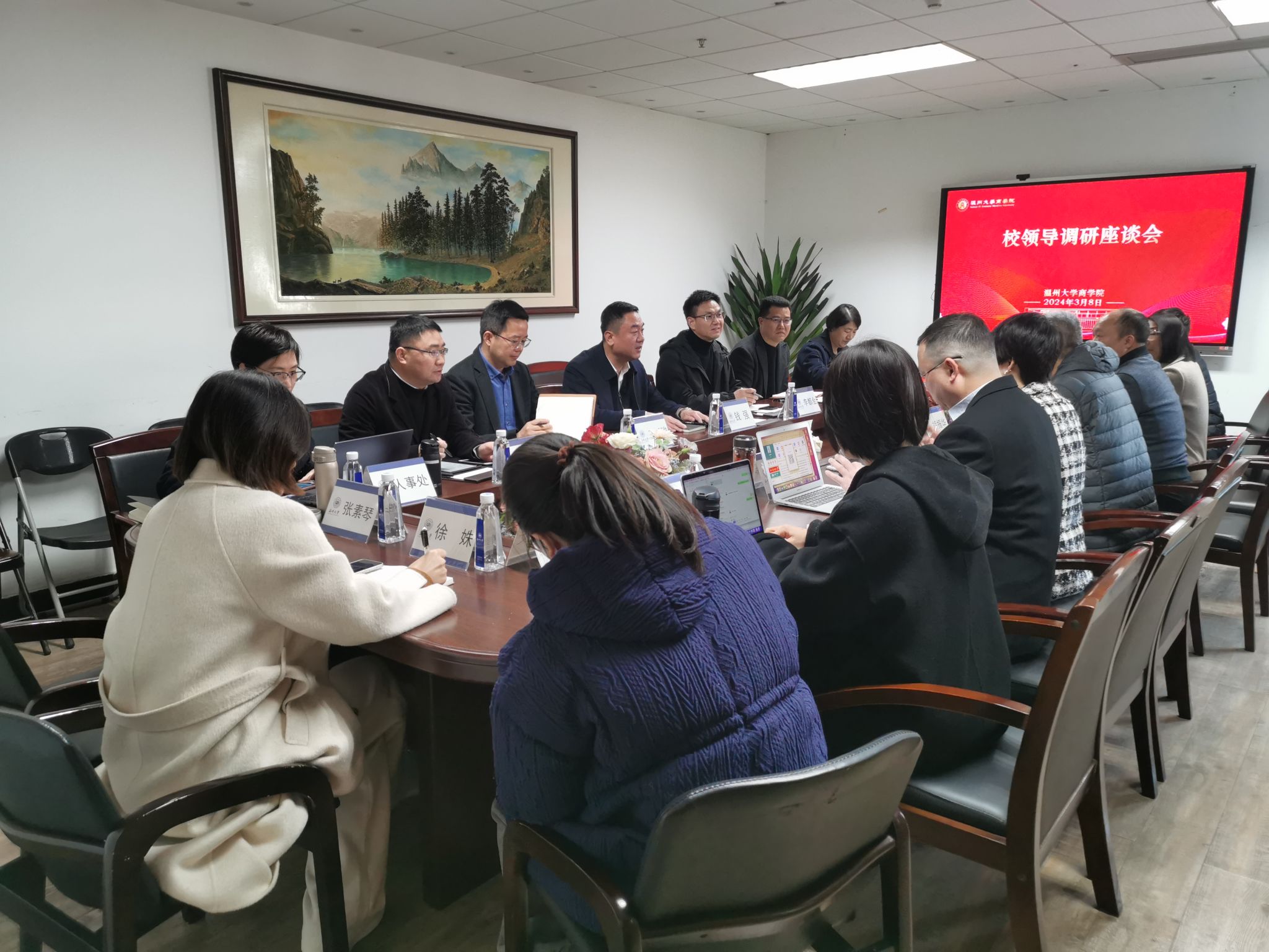 3月8日上午,校党委书记钱强、纪委书记李都金、副校长王尧骏一行调研商学院,教务处、研究生院、人文社科处、人事处等部门负责人陪同调研。商学院全体班子成员及科室负责人参加调研会。