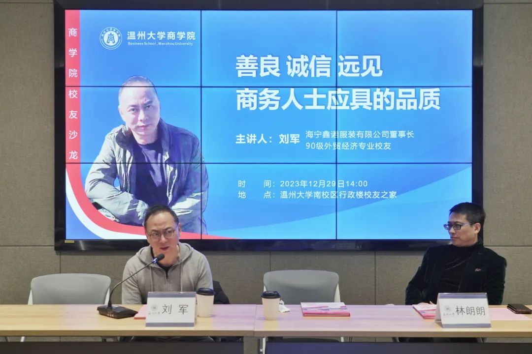 紧接着,刘军校友为同学们带来了以“商务人士应具备的品质”为主题的沙龙讲座。首先,刘军校友表示,思维是极其重要的,思维能改变人的一生,除此之外,机遇对于我们来说也尤为关键。他创业的时候正巧赶上了改革开放的机遇,并且抓住了这个机会,使他的事业取得极大进展。刘军校友还表示温州是个思维先进、开放,务实的城市,希望同学们能够把握这个优势。他列举了多个事例说明温州大学思维上的优势,希望同学们重视思维的发展、眼界的开拓。随后,刘军校友分享了三点至关重要的“生意经”。第一是善良,心宽一寸,受益三分;第二是诚信,人而无信,不知其可也;第三是远见,见微以知萌,见端以知末。