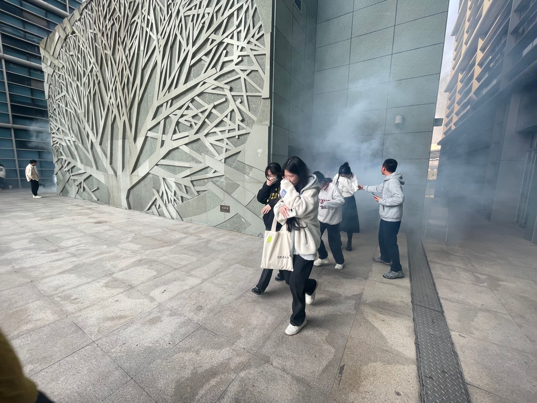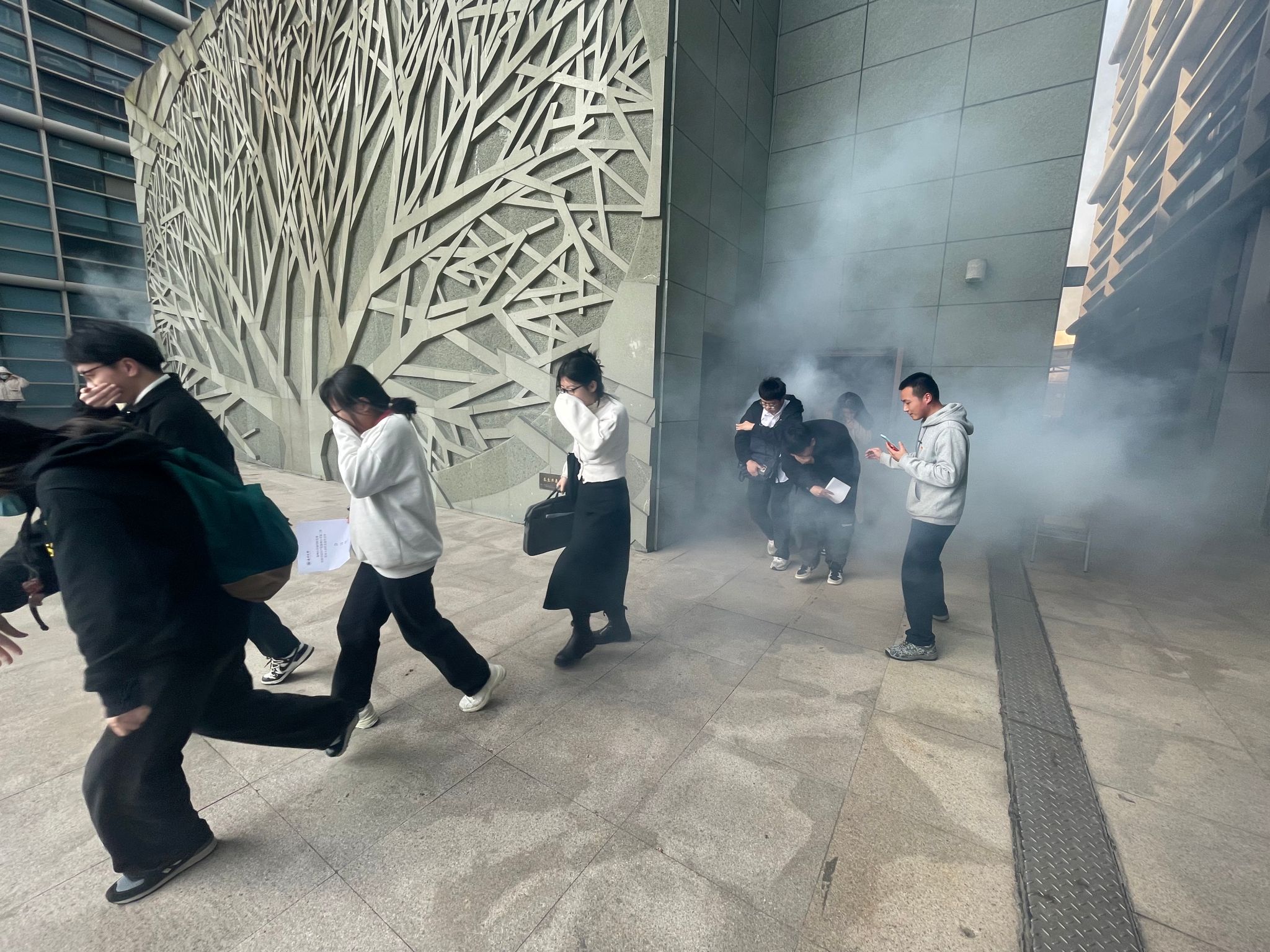 报告厅预设起火点浓烟滚滚,整个演练过程中,师生们冷静、有序、快速撤离,并及时拨打保卫处消防电话报告火警。撤离到安全地方后,安全员迅速清点学生人数,并及时汇报,整个疏散演练过程既紧张又有条不紊,师生安全地撤离到安全地带。