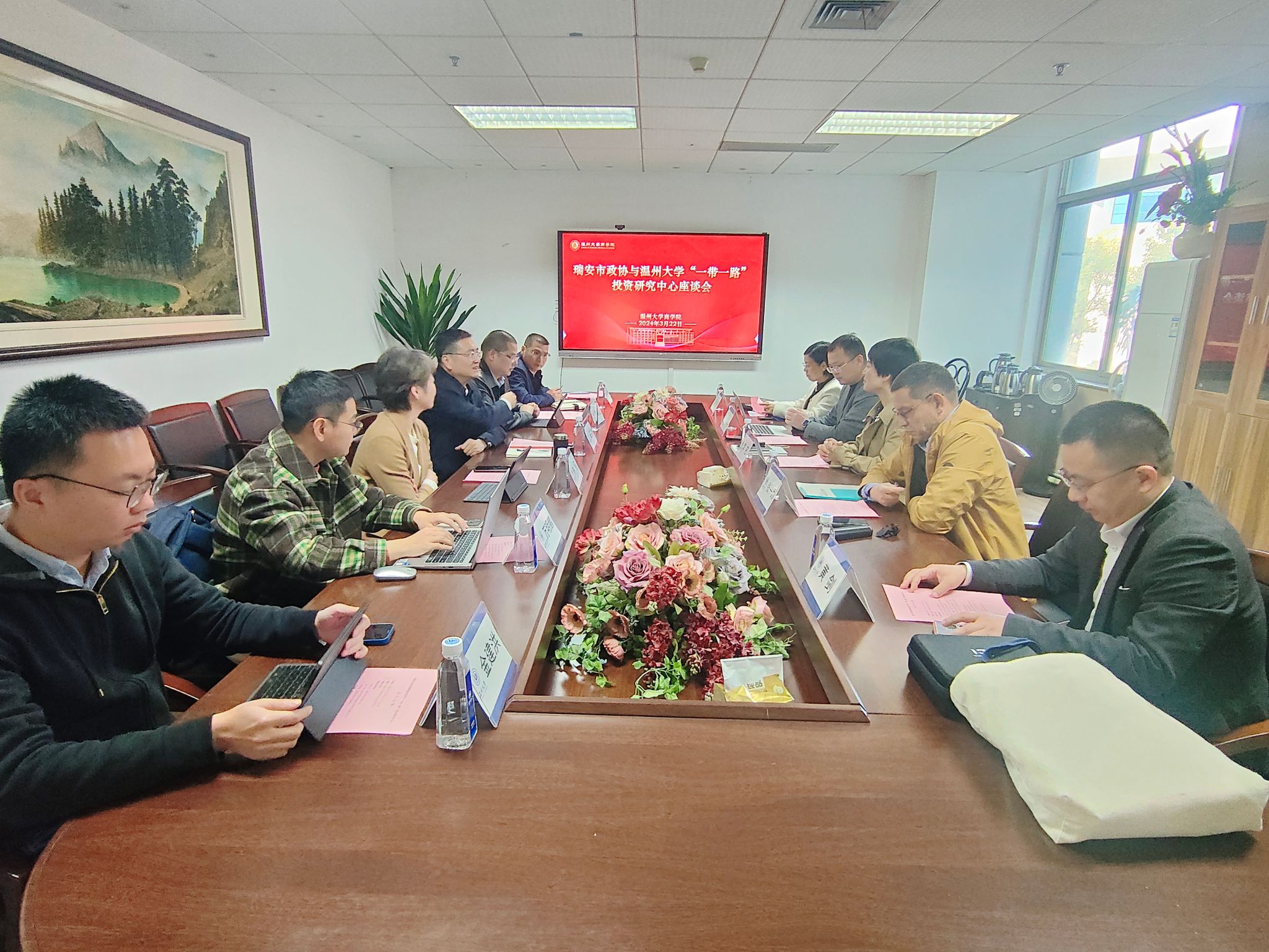 2024年3月22日,瑞安市政协副主席姜宗羽、瑞安市政协港澳台侨和外事委主任林栩、瑞安市商务局副局长陈朝波、瑞安市府办对外友好交流服务中心主任万明鹏一行来商学院调研。商学院党委书记李密、副院长余向前、温州市世界温州人研究中心秘书长张一力、温州大学“一带一路”投资研究中心主任林俐、温州市数字贸易研究院执行院长黄剑等参加座谈会。