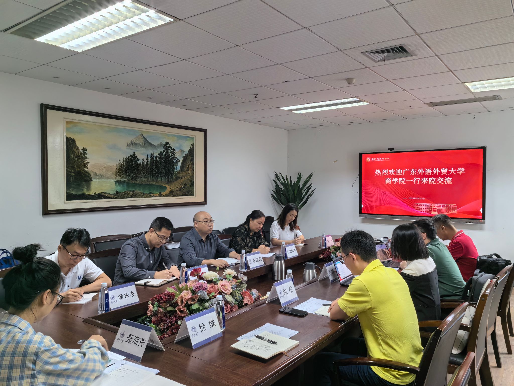 2024年5月22日上午,广东外语外贸大学商学院副院长曾楚宏等一行5人来到我院调研交流,商学院教学副院长陈文芝、跟岗干部方嘉奇、工商系主任陈敏、金融系主任林德根和教务科科长徐姝老师参加座谈交流。会议由教学副院长陈文芝主持。