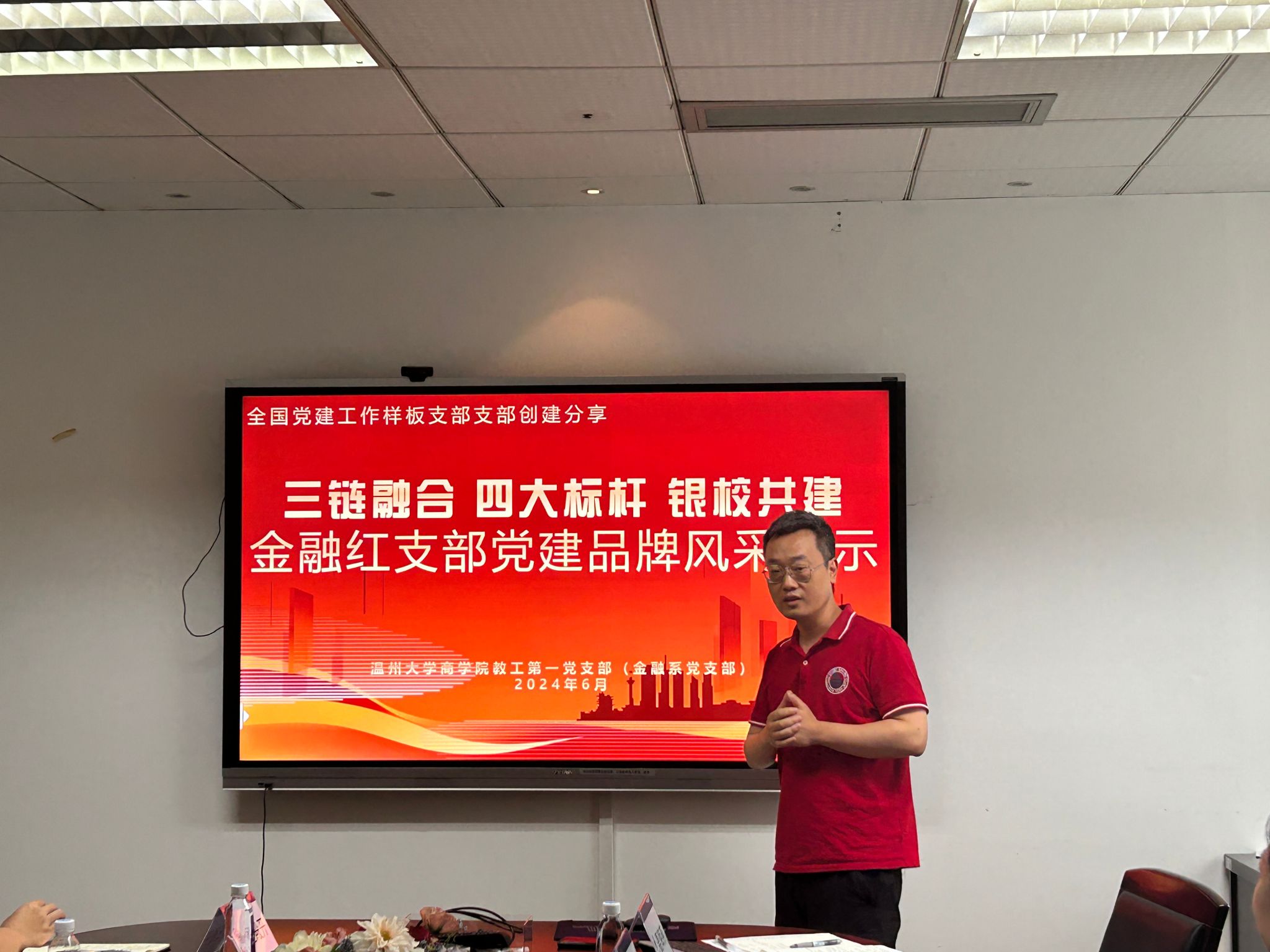 学院金融系主任兼教工第一党支部组织委员林德根就全国党建工作样板支部的创建作专题汇报。学院教工第一党支部于2024年4月成功获批为第四批“全国党建工作样板支部”培育创建单位,林主任分别从支部情况、创建思路、品牌特色、成果支撑等角度进行详细解读,尤其强调了在党建与业务深度融合背景下,支部成功构建的“1234”工程,即依托金融工程国家一流专业,实施“双轮驱动”,推进“三链融合”,实现“四大标杆”。