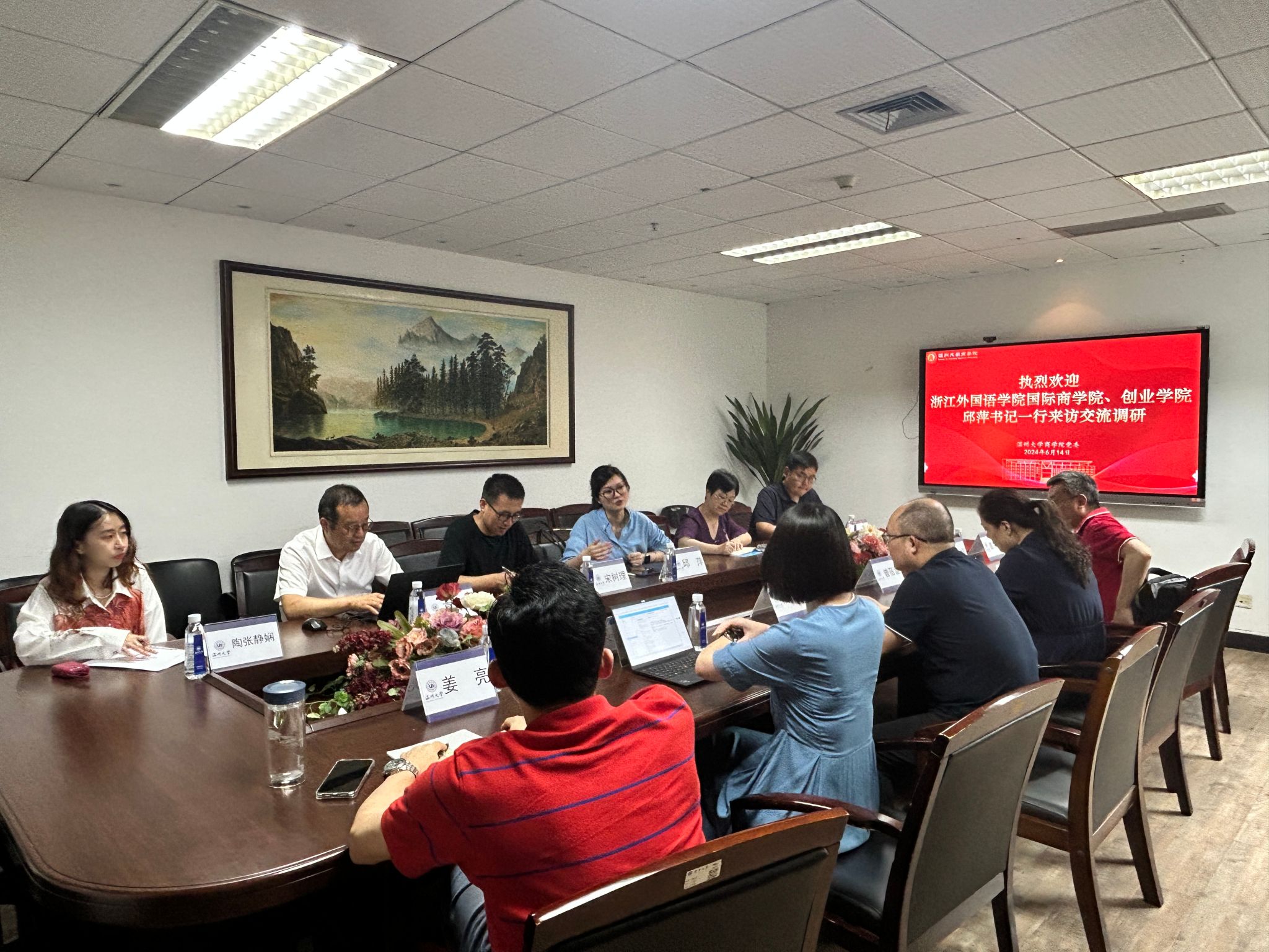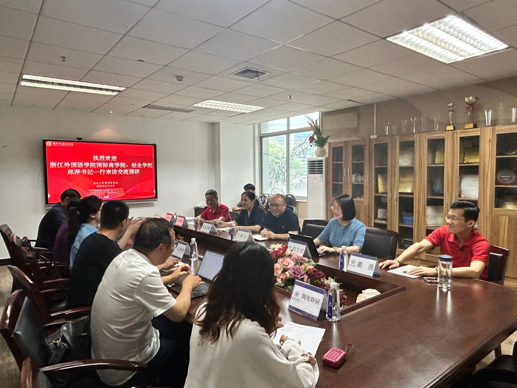 为进一步加强兄弟院系之间的交流合作,学习双方在党建工作、学科建设、专业发展以及人才培养等方面的经验与做法,6月14日下午,浙江外国语学院国际商学院、创业学院邱萍书记等一行6人到我院调研交流。学院党委书记唐华、副院长陈文芝、党委副书记曾蓓蕾、国贸系主任姜亮、金融系主任林德根出席了会议。