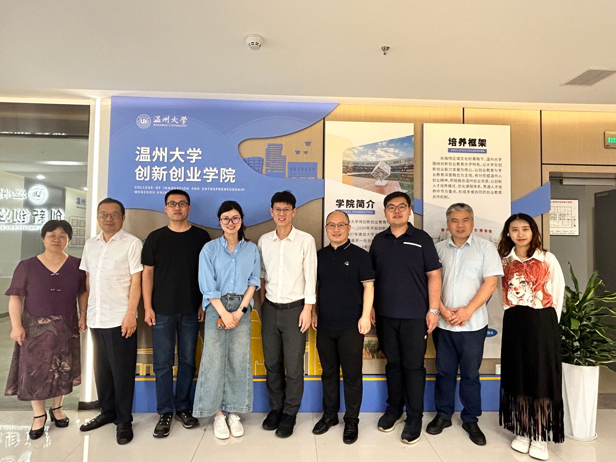 最后,在唐华书记的陪同下,邱萍书记一行还参观了温州大学创新创业学院,并合影留念。相信此次兄弟院系之间的调研交流能为双方的党建工作、学科建设、专业发展、人才培养等方面提供更多的思路,同时,也为后续的合作奠定良好的基础。