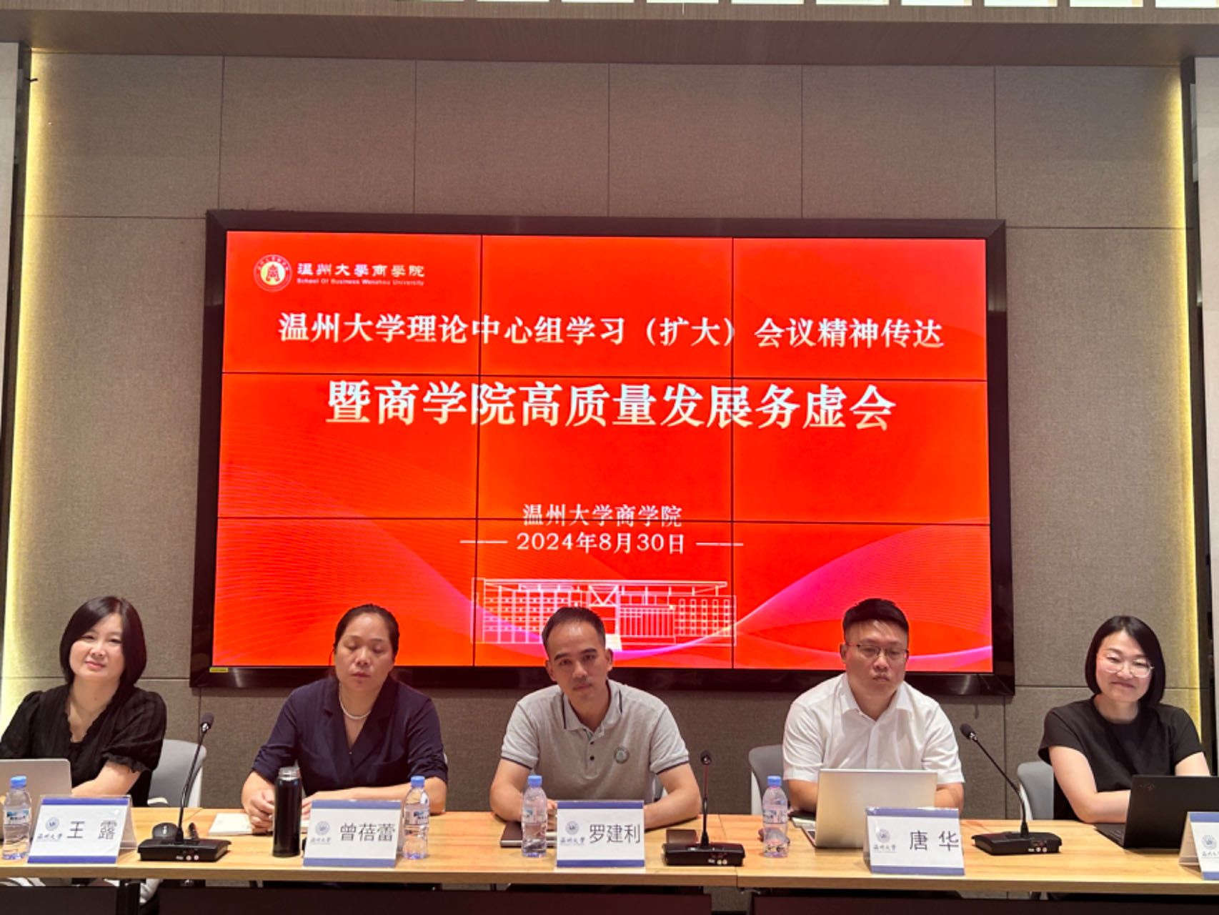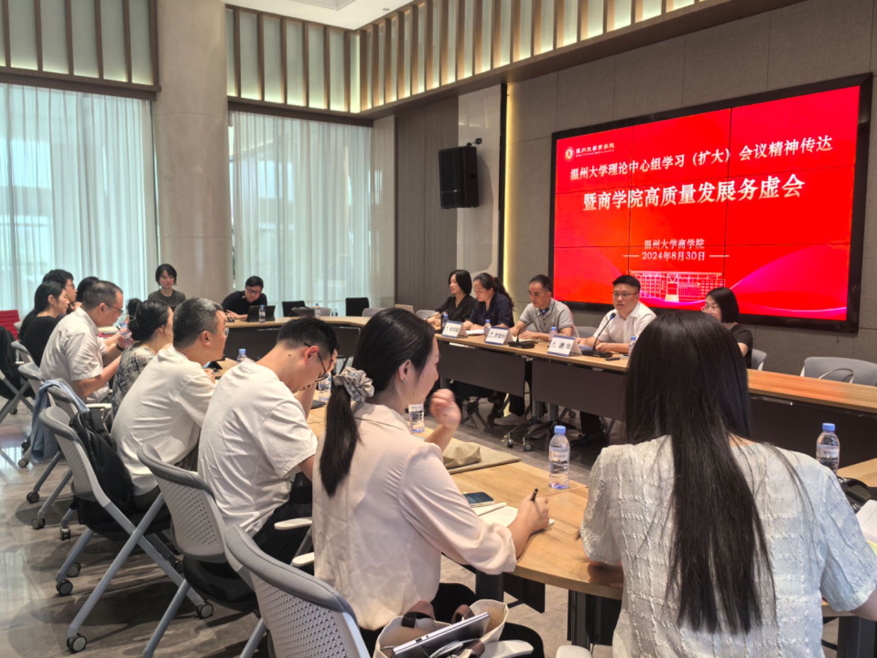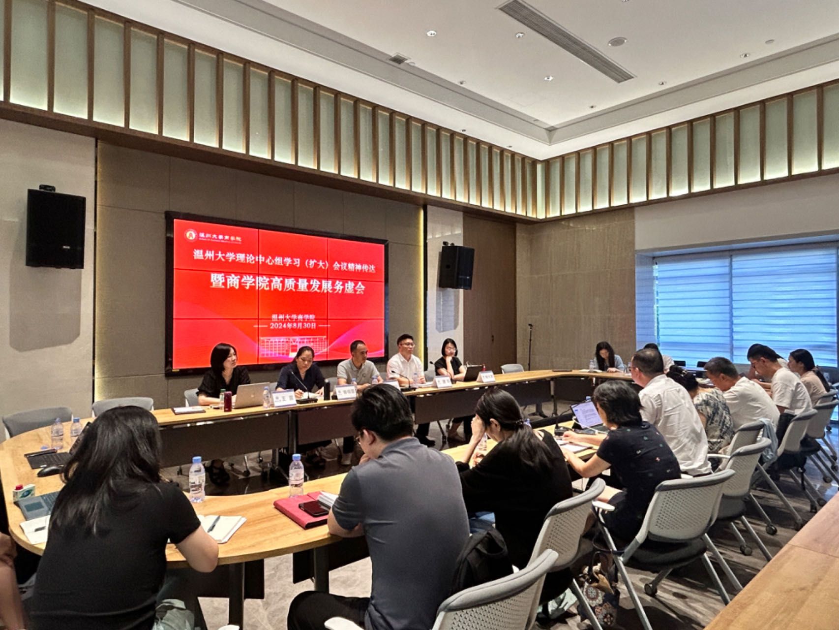 2024年8月30日上午,商学院召开党委理论学习中心组(扩大)学习会暨学院高质量发展务虚会,传达学校党委理论学习中心组(扩大)学习会会议精神,学习贯彻党的二十届三中全会精神,研究部署学院高质量发展贯彻落实举措。会议由党委书记唐华主持,院领导班子成员、各教工支部书记、各系主任、专业负责人、各科室负责人、教师代表等参会。