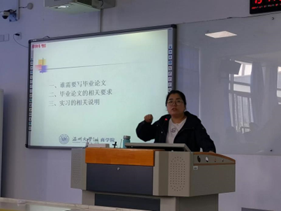 大会上,方嘉奇老师首先强调了毕业论文的重要性,提醒同学们所需关注的时间节点和完成质量要求,详细说明了系统所需进行的必要操作,并且督促全体学生要主动积极地联系指导老师。此外,方老师还说明了下学期的实习要求,强调了实习期间的安全问题,需要妥善处理实习与论文两者之间的时间分配,遇到问题要及时同指导老师沟通,并按时上传指导记录。