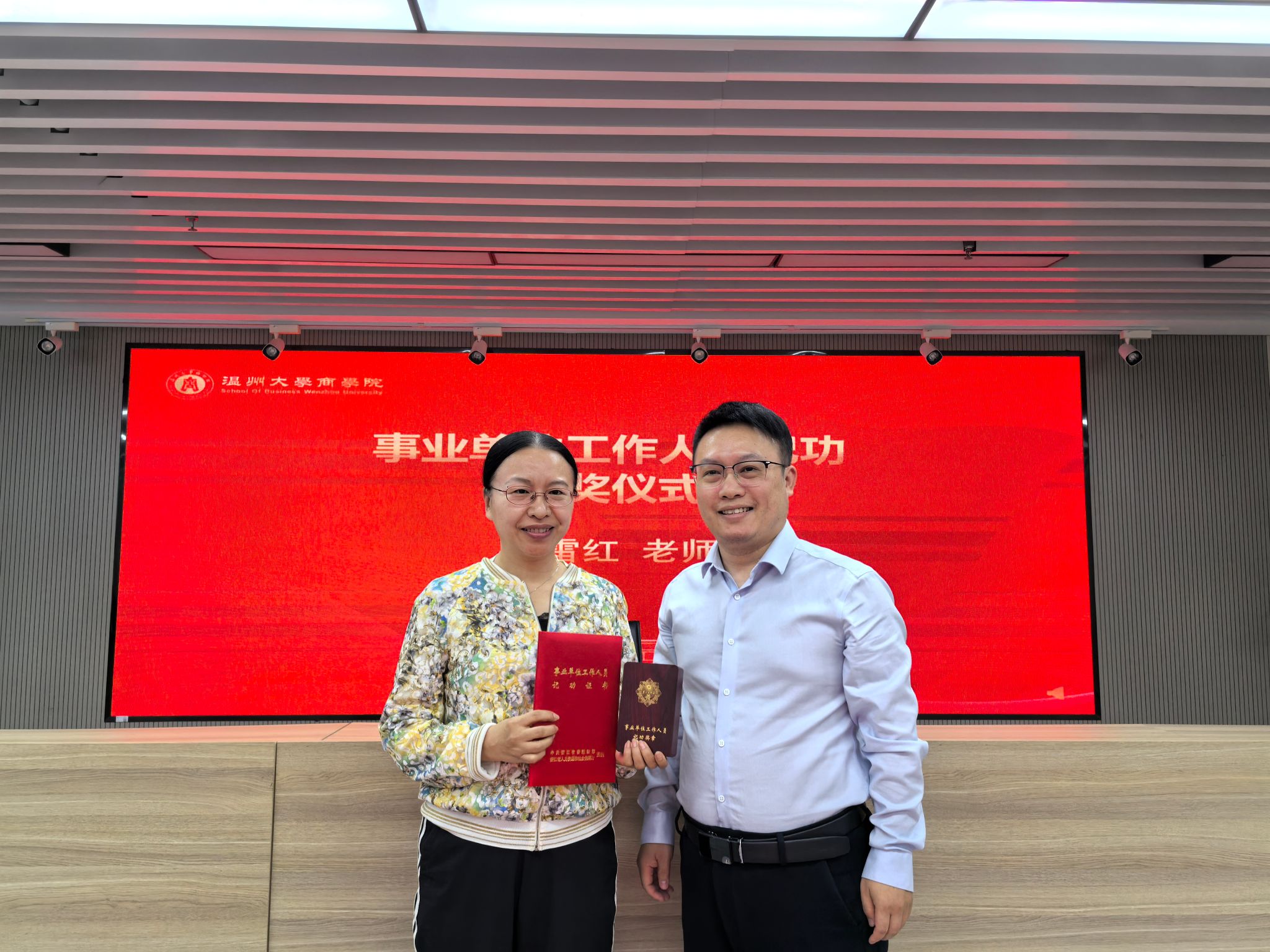 随后,唐华书记宣布2024年荣获事业单位工作人员记功荣誉的教师名单并为荣誉教师孙雷红老师颁发奖章和证书。唐华书记指出,市人社局将把事业单位工作人员连续三年年度考核优秀记功奖励工作作为一项制度安排,每年定期开展。学院未来也将以此为契机,进一步完善教师考核、奖励工作机制,充分发挥先进典型的示范引领作用,在全院形成崇尚先进、见贤思齐、比学赶超、争创一流的良好氛围,为推动商学院高质量发展汇聚强劲动能。
