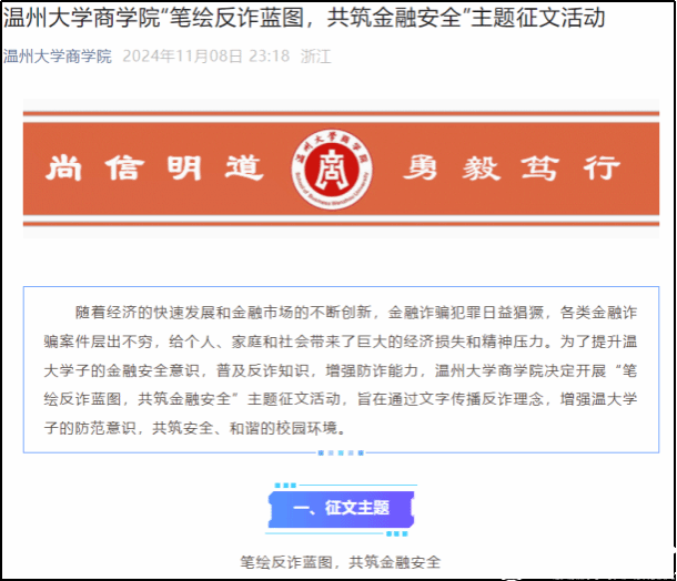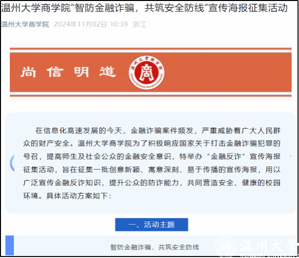 此外,学院研究生会还策划了“笔绘反诈蓝图,共筑金融安全”主题征文活动和“智防金融诈骗,共筑安全防线”宣传海报征集活动,通过文字和视觉艺术传播反诈理念,增强学生的防范意识,扩大活动影响力。
