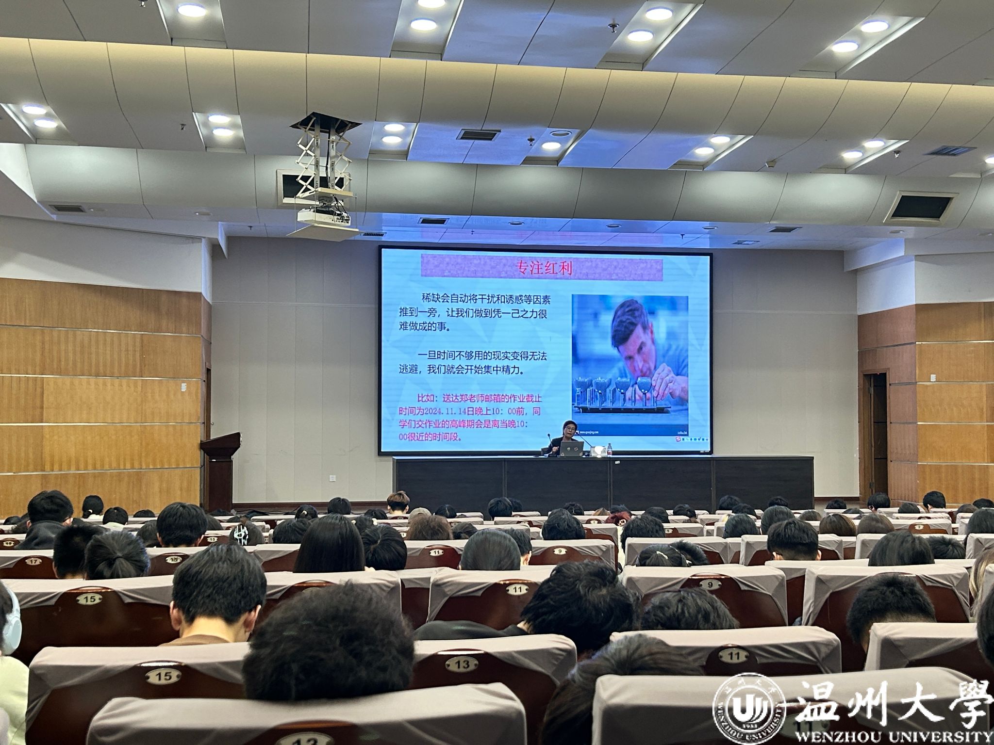 2024年11月14日晚,为帮助同学们正确认识“稀缺”本质,引导他们实现从稀缺到富足的转变,温州大学商学院特邀学校人事处处长郑彩莲老师为学院全体大一新生带来主题为“如何从稀缺走向富余”的心理幸福课