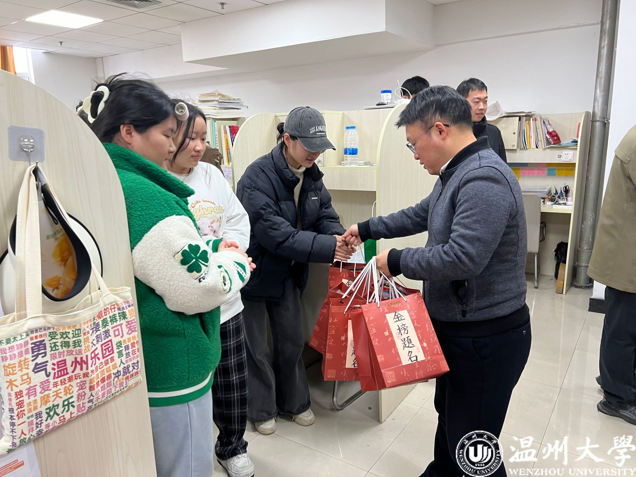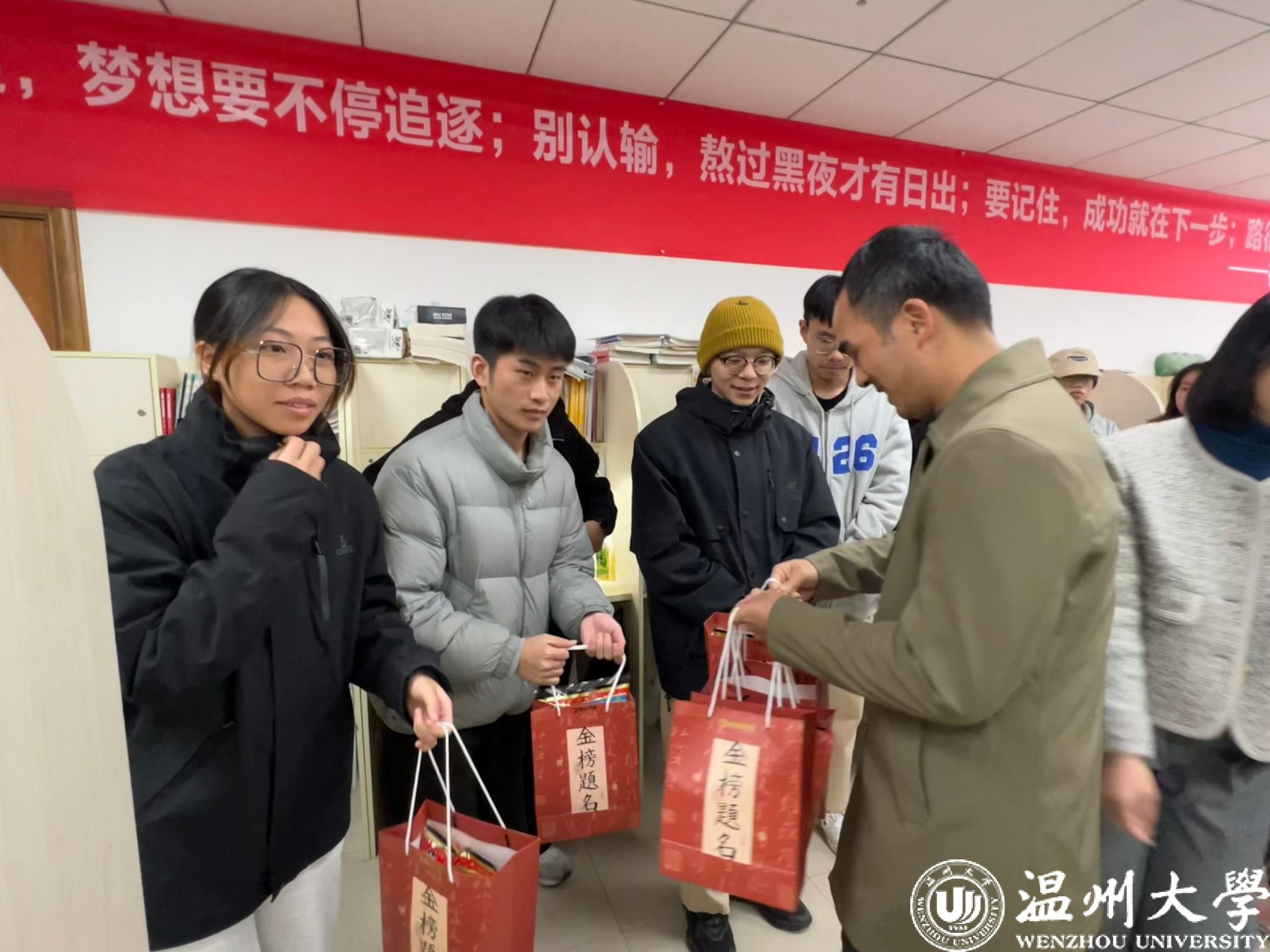 慰问团队送上精心准备的慰问品,巧克力祝考试顺滑、旺旺雪饼祝考运旺旺、升升薯条祝各位升学顺利等一一送到学子们手中。这些慰问品不仅是物质上的补给,更代表着对他们坚持梦想的肯定与期许。慰问过程中,各位领导与考研学子亲切交流。他们关切地询问学子们的备考情况,对大家的努力和付出表示高度赞赏,同时叮嘱要注意劳逸结合,合理安排作息时间,保持良好的身心状态迎接考试。“你们不是一个人在战斗,学校和老师会一直为你们保驾护航。”一句句暖心的话语,如冬日暖阳,驱散了学子们心头的压力与疲惫。