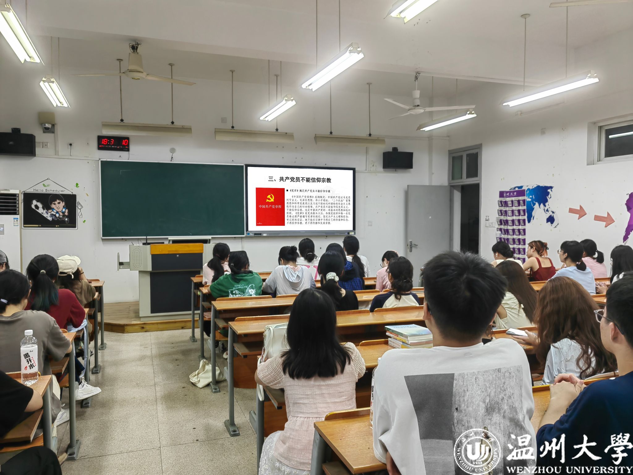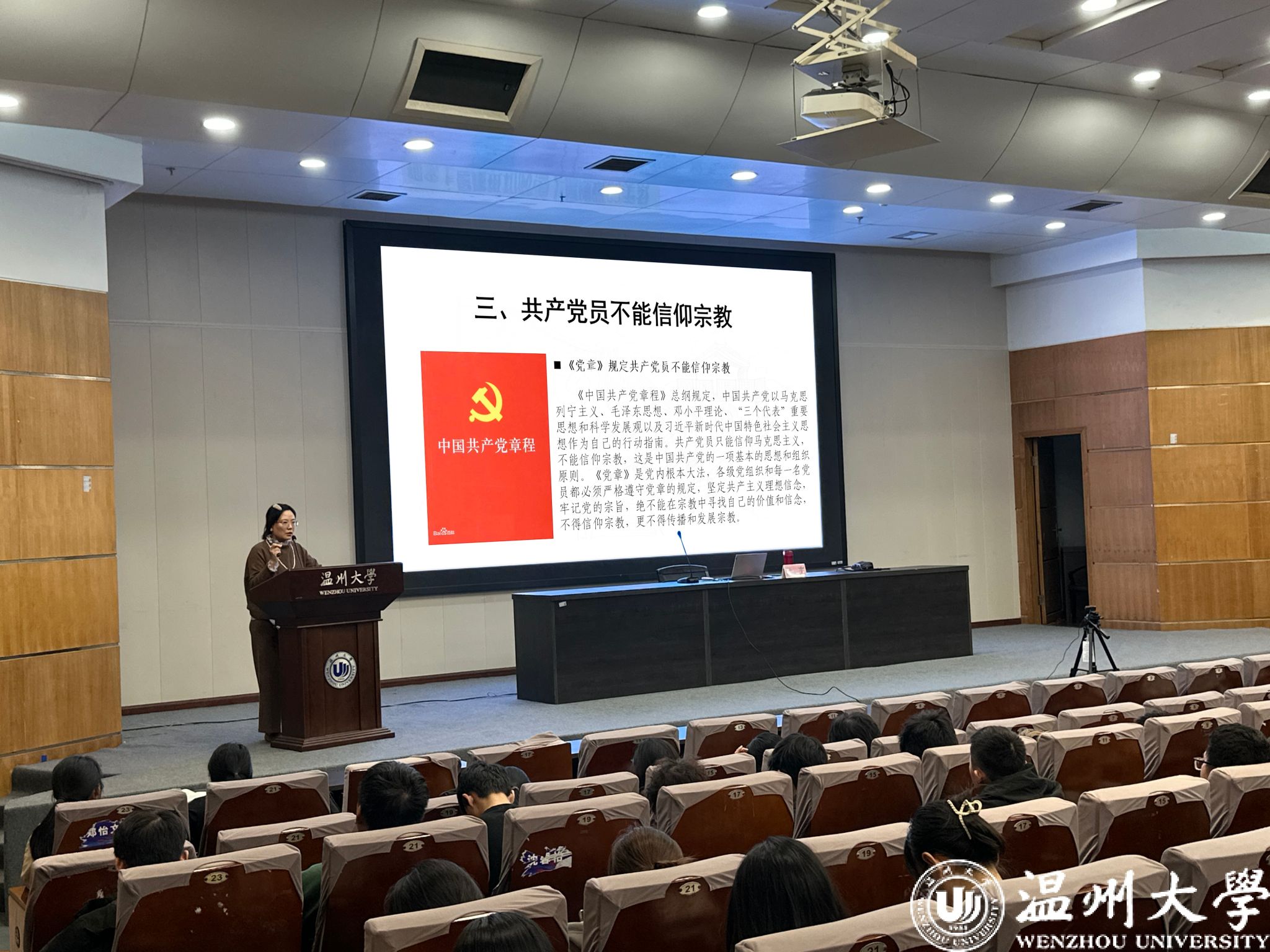 张宇老师从宗教的基本常识、马克思主义宗教观、宗教与学校教育的关系以及学校对信教学生的要求和相关政策等方面着手,对宗教、邪教、迷信等相近概念做了详细阐释和区分。老师结合真实案例讲解了非法宗教、邪教的危害,强调当代大学生应提升鉴别能力,自觉远离、抵制非法宗教和邪教。她强调,要正确认识党的宗教信仰自由政策;要积极引导宗教与社会主义社会相适应;坚持独立自主自办原则;坚持我国宗教事务和宗教团体不受外国势力支配;坚持宗教与教育相分离。
