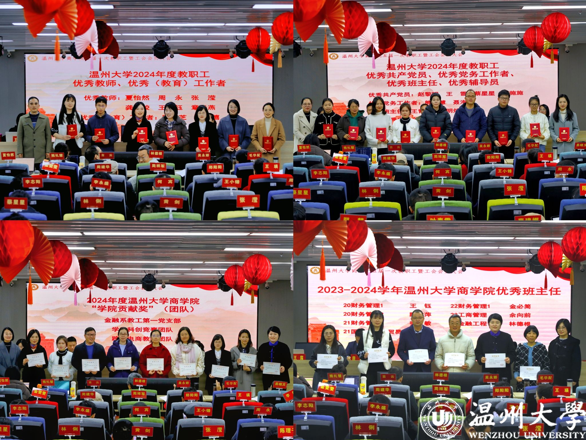 会议举行颁奖仪式,对温州大学2024年度教职工优秀共产党员、优秀党务工作者、优秀班主任、优秀辅导员、优秀教师、优秀(教育)工作者和2024年度温州大学商学院“学院贡献奖”获得者、优秀班主任进行表彰。