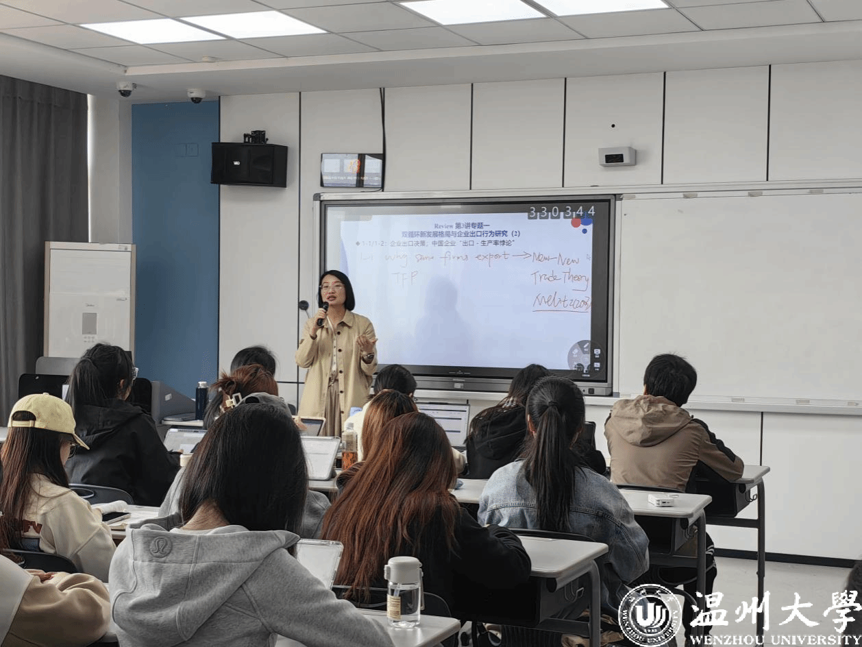 2025年4月25日上午,温州大学商学院《国际贸易文献导读》省级教改示范课在北2-407教室开讲。本次课程由省级教改项目负责人陈文芝老师主讲,教学督导孙雷红、叶春霞及全校各院系教师代表共10余人到场观摩。课程以“学术规范筑基、文献研习赋能”为主线,通过系统化的文献研读、方法论训练与思政浸润,展现了新文科背景下学术研究能力培养的创新范式。整节课分课程回顾、交流互动以及新文献汇报等环节。