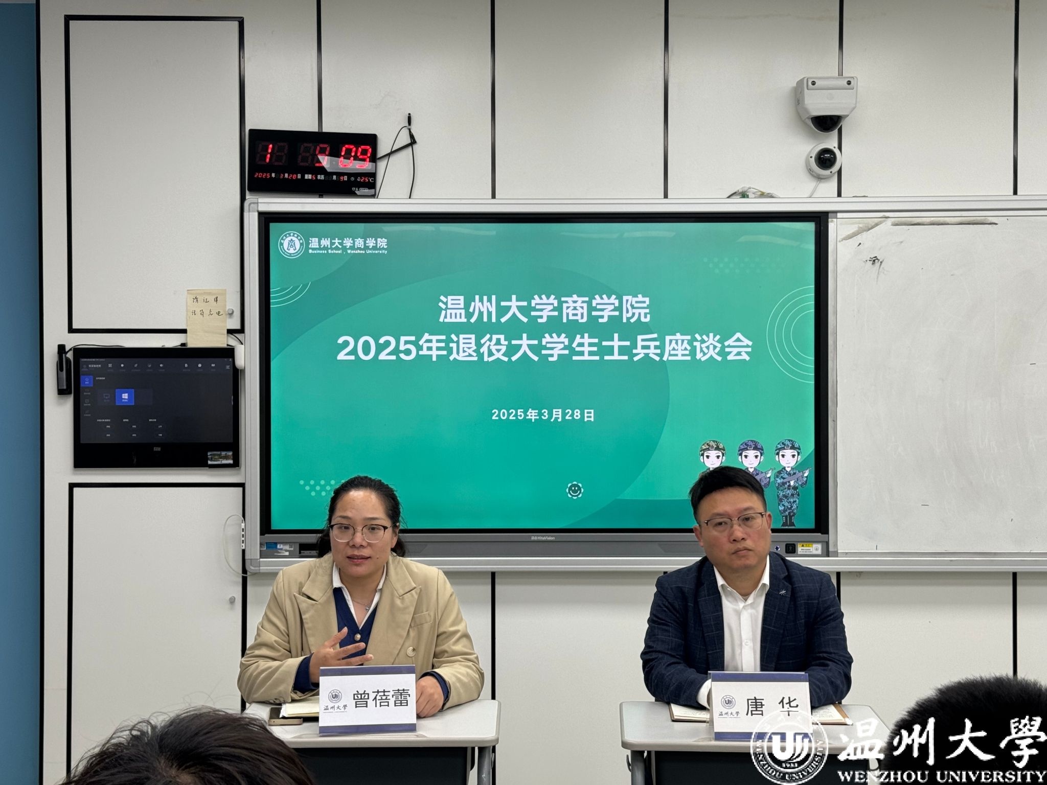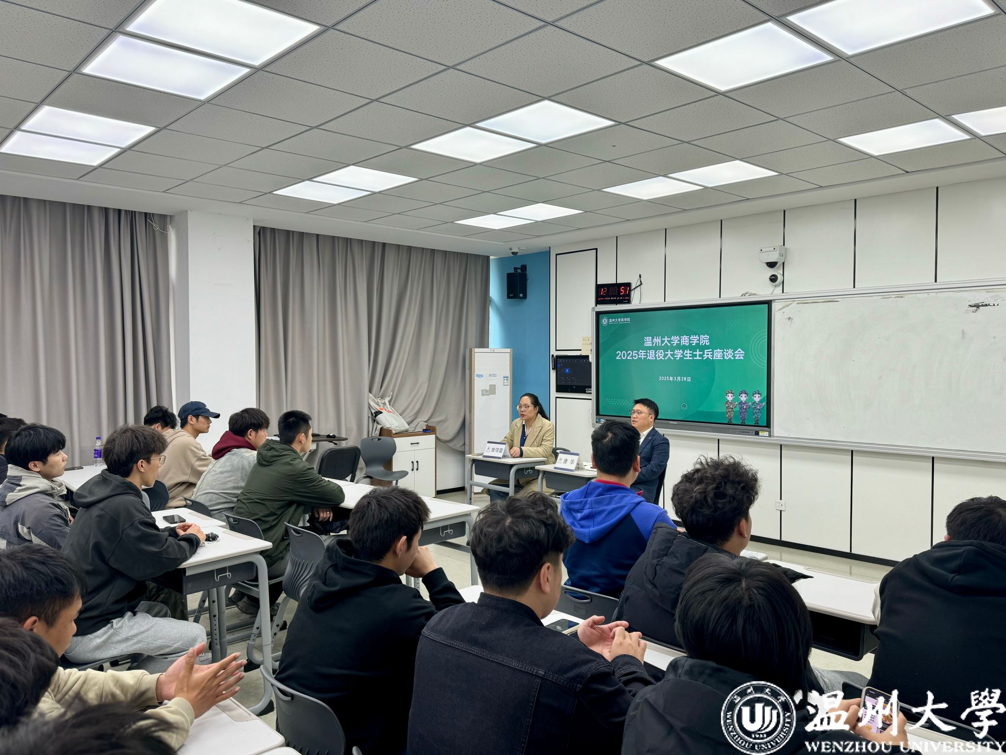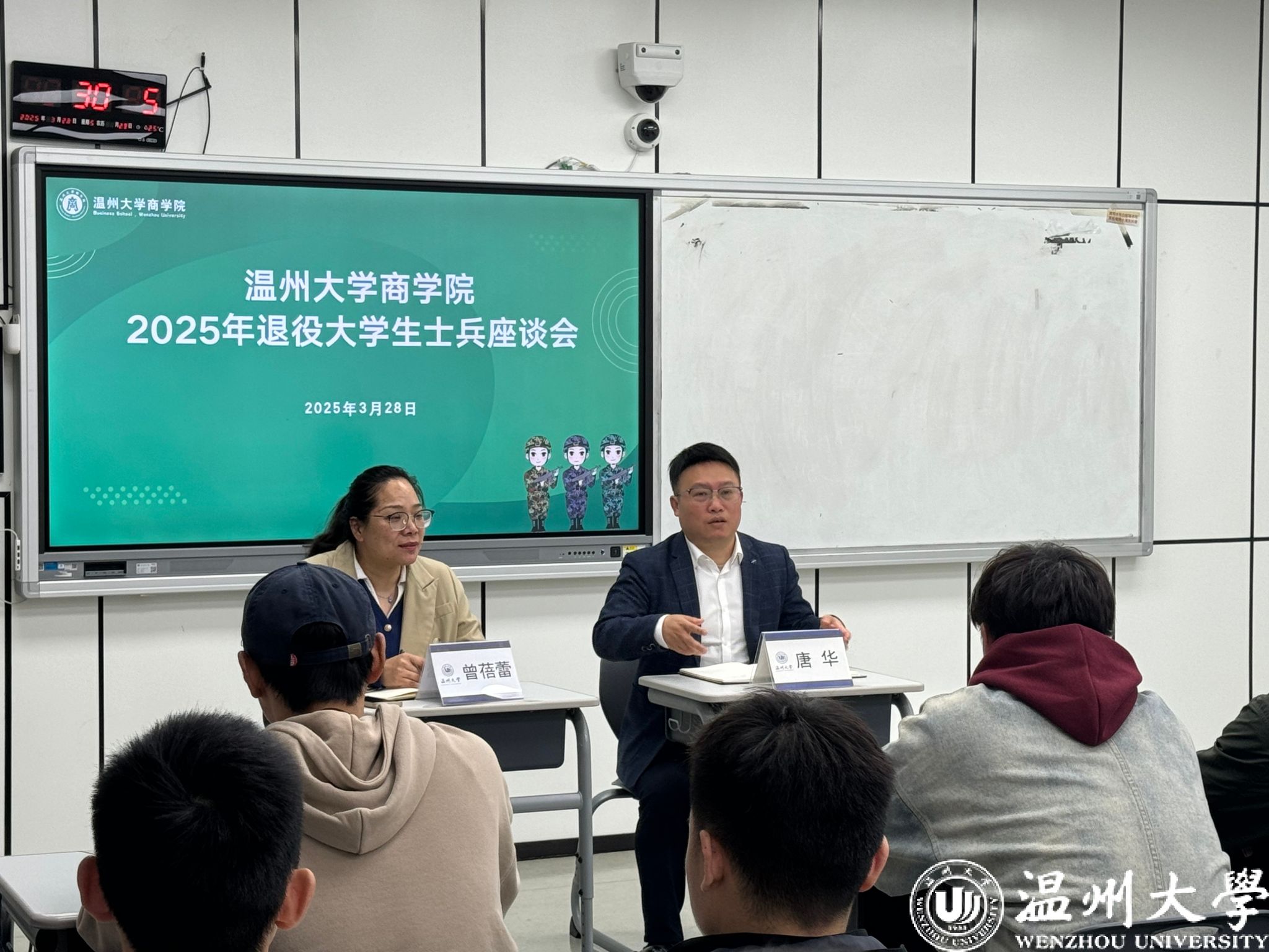 为深入贯彻落实新时代强军思想,持续深化对退役大学生士兵群体的关怀与支持,温州大学商学院于3月28日召开2024-2025学年第二学期退役大学生士兵座谈会。会议由学院党委副书记曾蓓蕾主持,学院党委书记唐华、退役大学生士兵代表等共同参与。
