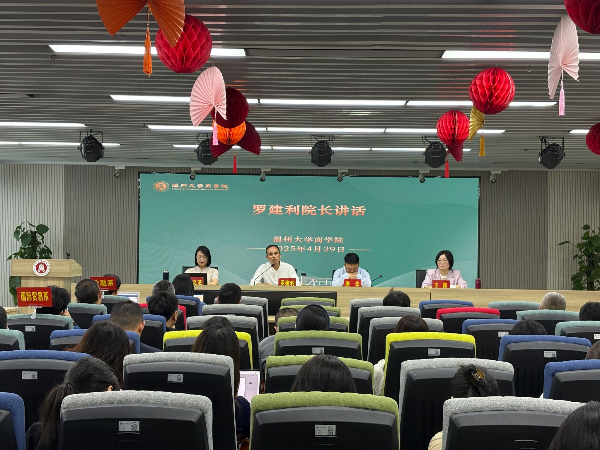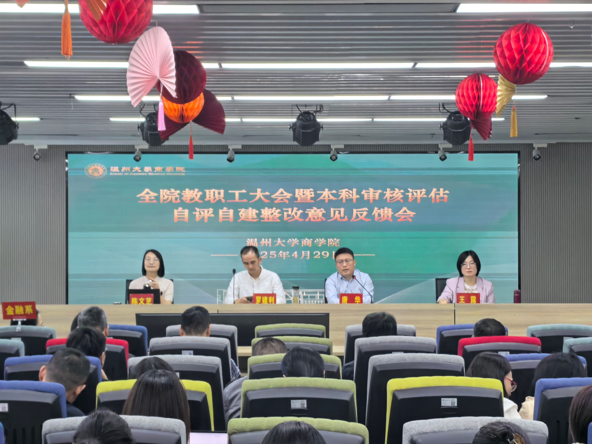 2025年4月29日下午,商学院在商院楼A226仲辉商道讲堂举行全院教职工大会暨本科审核评估自评自建整改意见反馈会,会议由学院党委书记唐华主持,学院全体教职工参加。