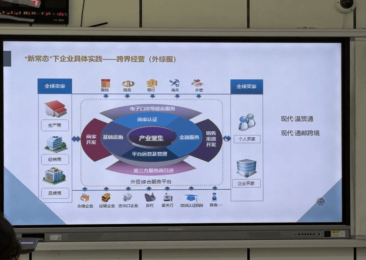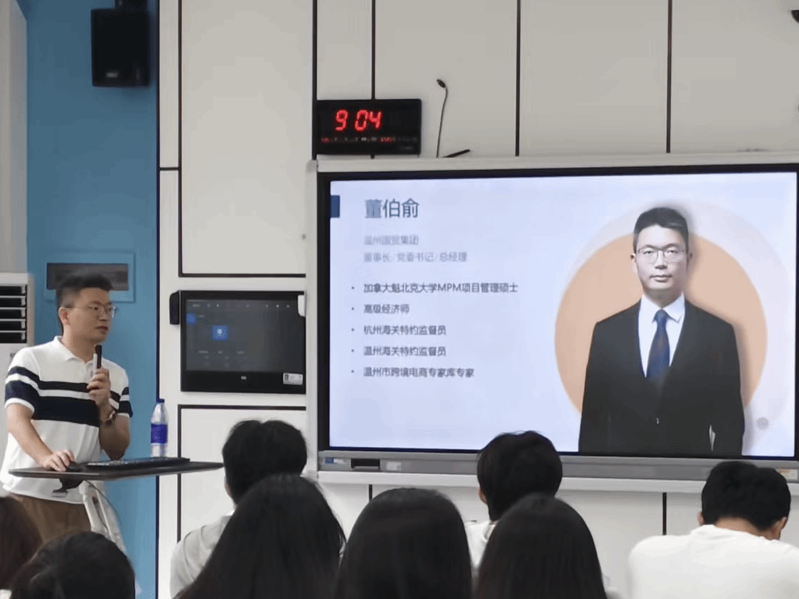 为深入推进校企合作,同时让学生了解国贸专业以后的就业前景和国际大环境对国贸经贸领域的影响,6月18日,温州国贸集团董伯俞总经理莅临我校,为我们温大商学院24国贸学子带来了以“新发展格局下,国际贸易的转型发展及企业实践”为主题的精彩讲座。