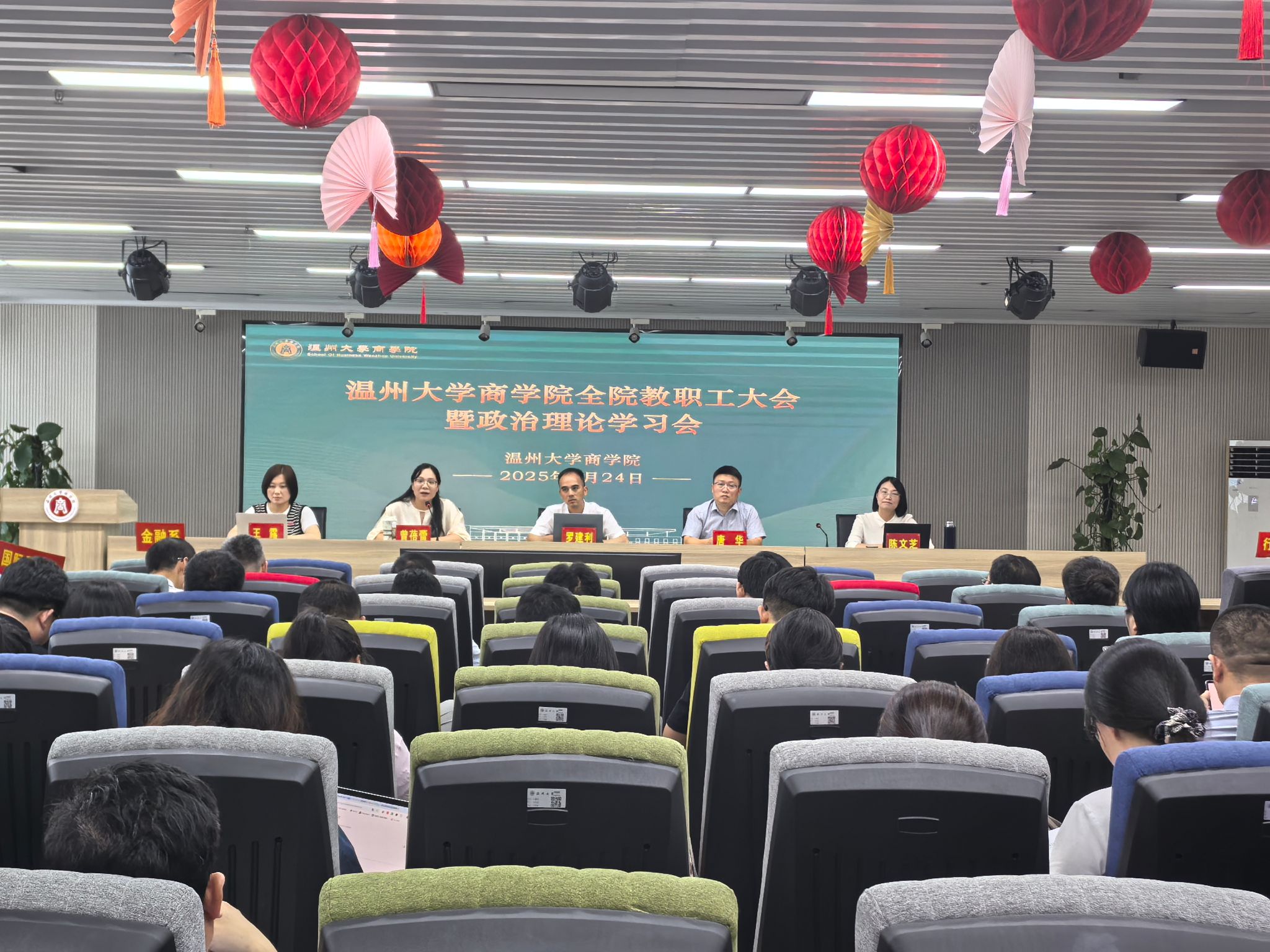 2025年6月24日下午,商学院在商院楼A226仲辉商道讲堂举行全院教职工大会暨政治理论学习会,会议由学院党委书记唐华主持,学院全体教职工参加。