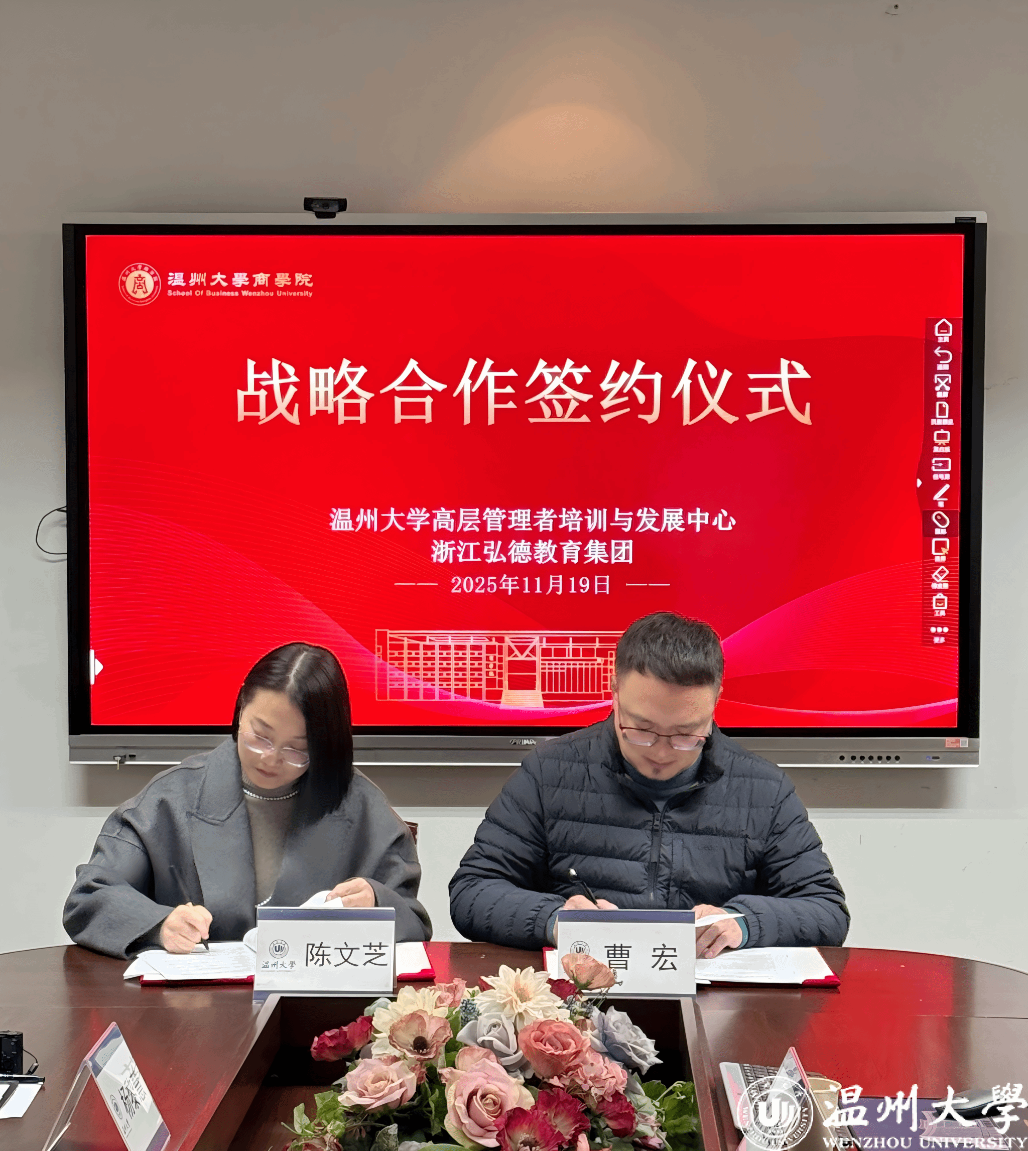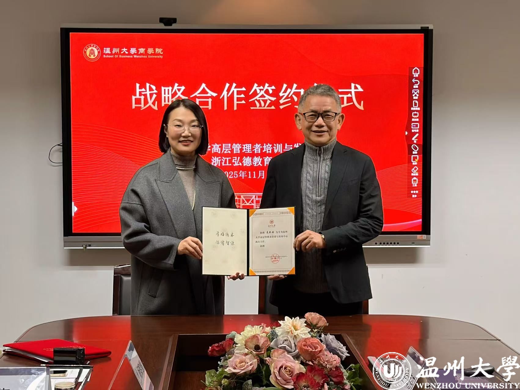 12月19日,温州大学商学院与弘德教育集团战略合作签约仪式暨温州大学高层管理者培训与发展中心(简称“温大EDP中心”)启动仪式隆重举行。温州大学商学院院长罗建利、温州大学EDP中心主任(温州大学商学院副院长)陈文芝、弘德教育集团总裁曹宏、董事金海芬、弘德商学院名誉院长来新安及双方代表出席签约仪式,共同见证这一校地协同赋能民营经济高质量发展的重要时刻。