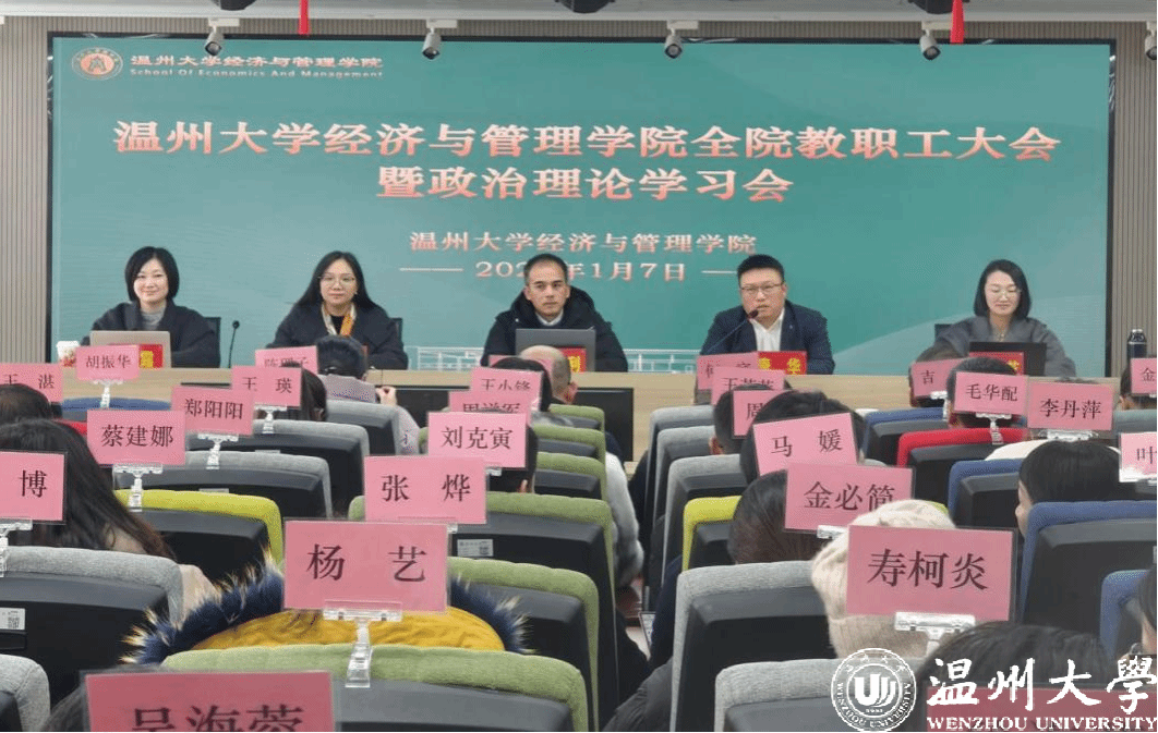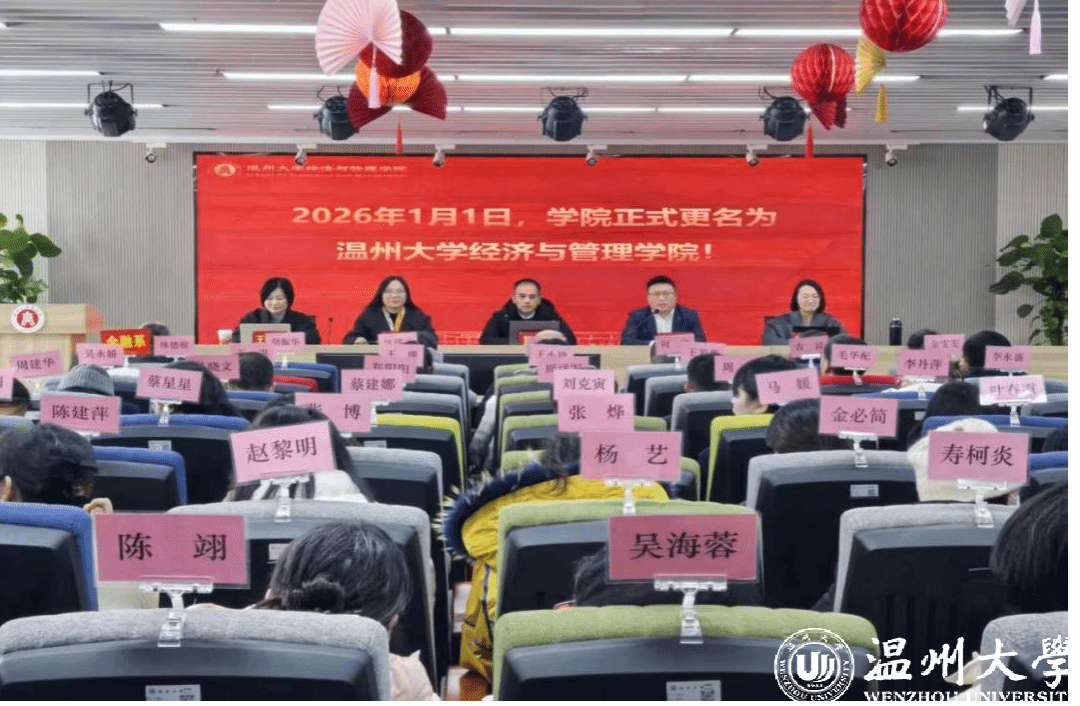 会议伊始,唐华书记宣布:学院自2026年1月1日起正式更名为“温州大学经济与管理学院”。他强调,此次更名是学院发展的重要里程碑,标志着学院迈入全新发展阶段。学院将以此为契机,整合学科资源、优化布局结构、深化交叉融合,持续提升人才培养与科研创新能力,号召全体师生凝心聚力,共同推动学院高质量发展,为服务区域经济社会作出更大贡献。