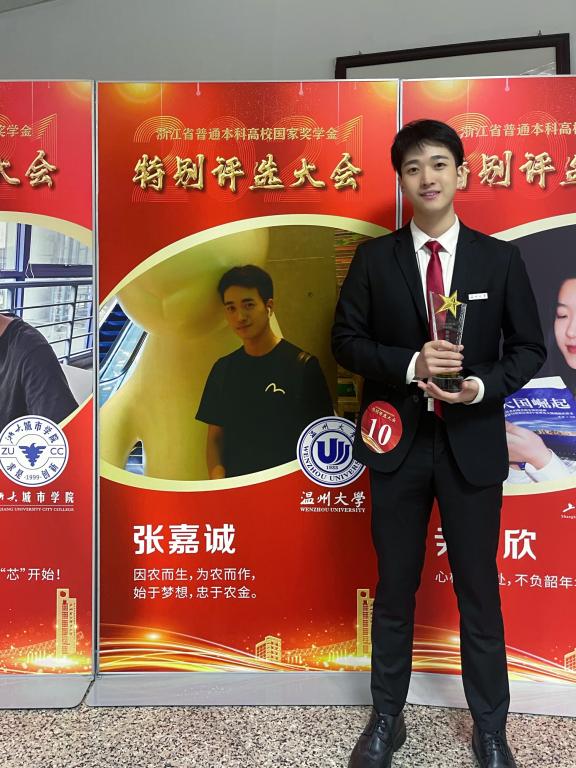 班主任何宾提起张嘉诚也是赞不绝口:“他最让我佩服的是他有清晰的规划,超强的执行力和自我监控能力。”班主任细数他在校期间拿下的3个“专业第一”:绩点第一、综合评测第一、获奖数量第一。其中包括:课程平均绩点4.33,连续两年荣获温州大学“学习标兵”称号; 负责多项省级、校级课题,撰写论文被SCI期刊录用;在“挑战杯”大学生课外学术科技作品大赛上获国赛二等奖、国赛三等奖和浙江省特等奖,在全国大学生英语能力竞赛上获二等奖、浙江省职业生涯规划大赛一等奖等高含金量奖项;2021年获得全省仅10人的本科高校国家级奖学金特别评选资格……据不完全统计,他已经获得国家级奖项4项,省级奖项12项,校级奖项40余项。