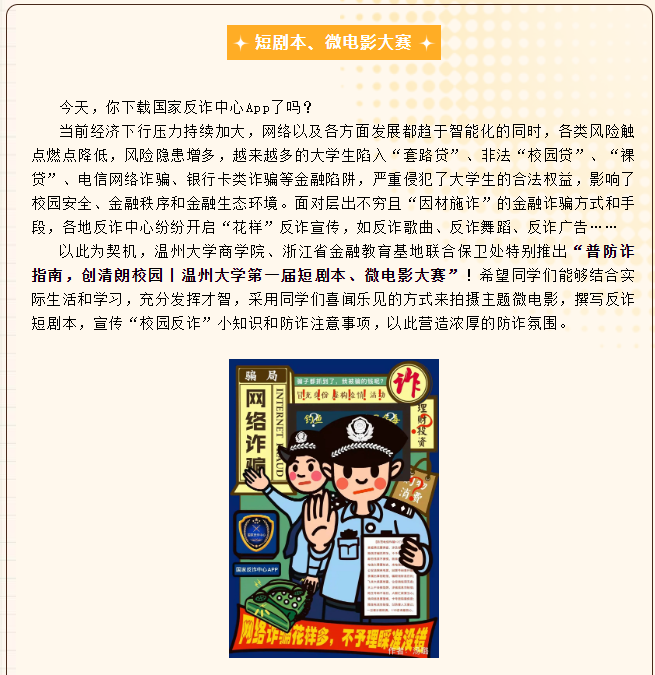 为了让更多学生了解金融知识,防范金融诈骗,金融宣传教育基地联合温州大学保卫处特别推出“普防诈指南,创清朗校园|温州大学第一届短剧本、微电影大赛”,通过短剧本、微电影的制作,营造浓厚的防诈氛围,让更多的学生能更深刻理解防范电信诈骗的重要性。截至4月22日,共收到来自5个学院共计22份作品,如教育学院作品《贷价》和商学院作品《贷价》,两个作品虽然题目相同,但主题主线的切入点却大有不同,给同学们日常防诈、反诈提供新的视角,目前所有作品正在火热投票评选中。