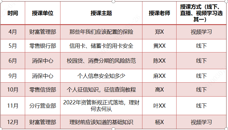 为落实将金融教育纳入国民教育体系工作,招商银行温州分行计划按月在温州大学商学院开展月度金融讲堂。通过广泛征集系统内金融教育课件,制定《招商银行温州分行月度金融讲堂授课表》,明确全年授课主题、授课老师及授课方式。授课主题包括理财、基金、黄金、保险、外汇、个人贷款、银行卡(信用卡)使用、防范电信诈骗等内容,授课方式包括班级(金融宣讲团)现场授课、网络直播、视频学习等方式。