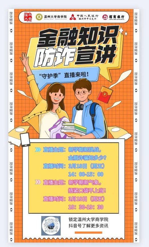 为让在校学生更好地学习金融教育知识、提升金融防诈意识和金融素养,维护校园和谐稳定,3月18日,在人行温州市中心支行指导下,温州分行联合温州大学商学院在金融宣传教育直播基地开展“3.15”消费者权益保护周防诈直播活动。在直播中,招商银行理财经理与温州大学商学院党员金融公益宣讲团成员通过生动形象的案例介绍,讲解了当前电信诈骗常用伎俩,并通过在线与学生互动、编辑顺口溜等方式,提升金融教育的参与度与传播性,活动通过抖音直播的方式进行,整场活动收获1.5万+关注量。与此同时,为了能让防诈宣讲走进班级、走进课堂,达到入脑入耳入心的效果,温州大学商学院党员金融公益宣讲团成员下驻到温州大学各学院、各班级进行宣讲。自4月以来,宣讲团成员已陆续在商学院、化学与材料工程学院、建筑工程学院、生命与环境科学学院、电气与电子工程学院、外语学院等学院宣讲,覆盖班级达50余个,覆盖学生人数高达约2700人。