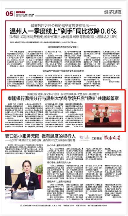 此次活动为温州大学商学院与泰隆银行温州分行“银校”共建开创了良好局面,为今后双方通过党建共建、实习基地、联合培养基地等形式进一步深化“银校”合作翻开了新篇章。通讯员 厉方琼