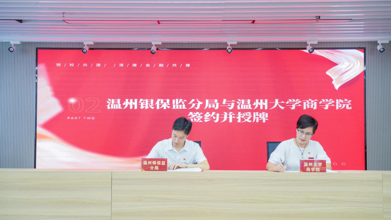 6月28日,温州大学商学院党委与温州银保监分局党委举行“银校共建”暨清廉金融共建合作框架协议签约仪式。温州市银行业协会、保险行业协会、证券期货业协会负责人,各大银行、保险、证券期货行业代表,商学院师生代表约40人参加了活动。